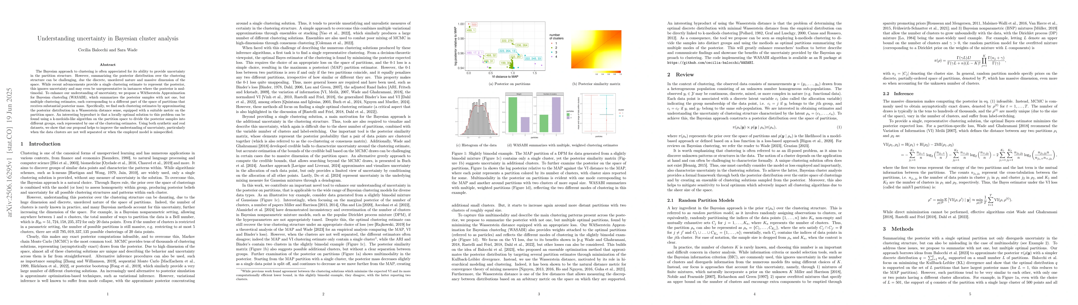 The Bayesian approach to clustering is often appreciated for its ability to provide uncertainty in the partition structure. However, summarizing the posterior distribution over the clustering structure can be challenging, due the discrete, unordered nature and massive dimension of the space. While recent advancements provide a single clustering estimate to represent the posterior, this ignores uncertainty and may even be unrepresentative in instances where the posterior is multimodal. To enhance our understanding of uncertainty, we propose a WASserstein Approximation for Bayesian clusterIng (WASABI), which summarizes the posterior samples with not one, but multiple clustering estimates, each corresponding to a different part of the space of partitions that receives substantial posterior mass. Specifically, we find such clustering estimates by approximating the posterior distribution in a Wasserstein distance sense, equipped with a suitable metric on the partition space. An interesting byproduct is that a locally optimal solution to this problem can be found using a k-medoids-like algorithm on the partition space to divide the posterior samples into different groups, each represented by one of the clustering estimates. Using both synthetic and real datasets, we show that our proposal helps to improve the understanding of uncertainty, particularly when the data clusters are not well separated or when the employed model is misspecified.
