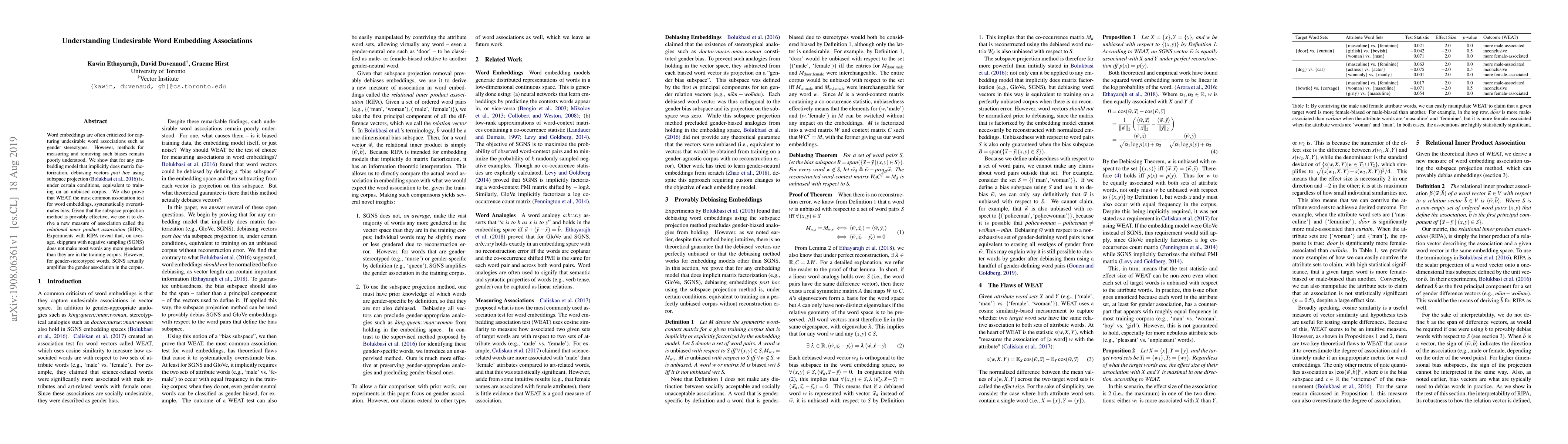 Word embeddings are often criticized for capturing undesirable word associations such as gender stereotypes. However, methods for measuring and removing such biases remain poorly understood. We show that for any embedding model that implicitly does matrix factorization, debiasing vectors post hoc using subspace projection (Bolukbasi et al., 2016) is, under certain conditions, equivalent to training on an unbiased corpus. We also prove that WEAT, the most common association test for word embeddings, systematically overestimates bias. Given that the subspace projection method is provably effective, we use it to derive a new measure of association called the $\textit{relational inner product association}$ (RIPA). Experiments with RIPA reveal that, on average, skipgram with negative sampling (SGNS) does not make most words any more gendered than they are in the training corpus. However, for gender-stereotyped words, SGNS actually amplifies the gender association in the corpus.
