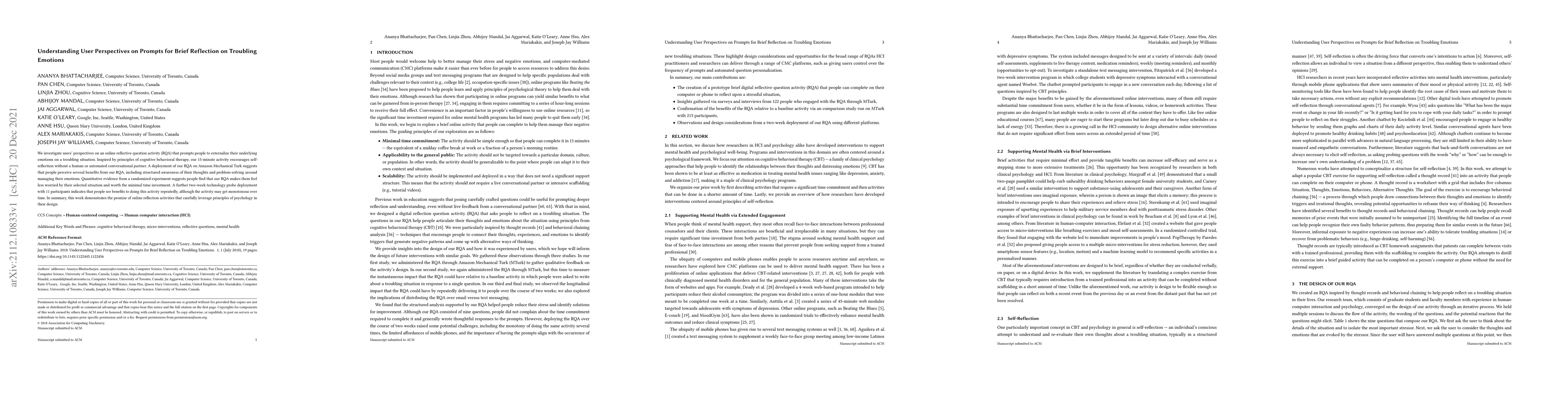 We investigate users' perspectives on an online reflective question activity (RQA) that prompts people to externalize their underlying emotions on a troubling situation. Inspired by principles of cognitive behavioral therapy, our 15-minute activity encourages self-reflection without a human or automated conversational partner. A deployment of our RQA on Amazon Mechanical Turk suggests that people perceive several benefits from our RQA, including structured awareness of their thoughts and problem-solving around managing their emotions. Quantitative evidence from a randomized experiment suggests people find that our RQA makes them feel less worried by their selected situation and worth the minimal time investment. A further two-week technology probe deployment with 11 participants indicates that people see benefits to doing this activity repeatedly, although the activity may get monotonous over time. In summary, this work demonstrates the promise of online reflection activities that carefully leverage principles of psychology in their design.