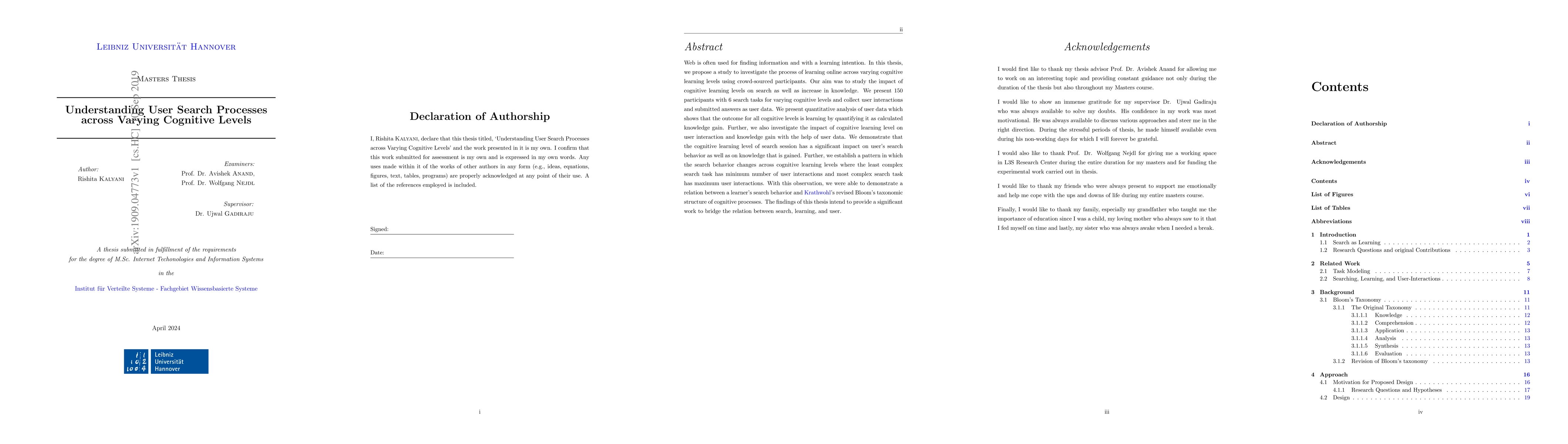 Web is often used for finding information and with a learning intention. In this thesis, we propose a study to investigate the process of learning online across varying cognitive learning levels using crowd-sourced participants. Our aim was to study the impact of cognitive learning levels on search as well as increase in knowledge. We present 150 participants with 6 search tasks for varying cognitive levels and collect user interactions and submitted answers as user data. We present quantitative analysis of user data which shows that the outcome for all cognitive levels is learning by quantifying it as calculated knowledge gain. Further, we also investigate the impact of cognitive learning level on user interaction and knowledge gain with the help of user data. We demonstrate that the cognitive learning level of search session has a significant impact on user's search behavior as well as on knowledge that is gained. Further, we establish a pattern in which the search behavior changes across cognitive learning levels where the least complex search task has minimum number of user interactions and most complex search task has maximum user interactions. With this observation, we were able to demonstrate a relation between a learner's search behavior and Krathwohl's revised Bloom's taxonomic structure of cognitive processes. The findings of this thesis intend to provide a significant work to bridge the relation between search, learning, and user.