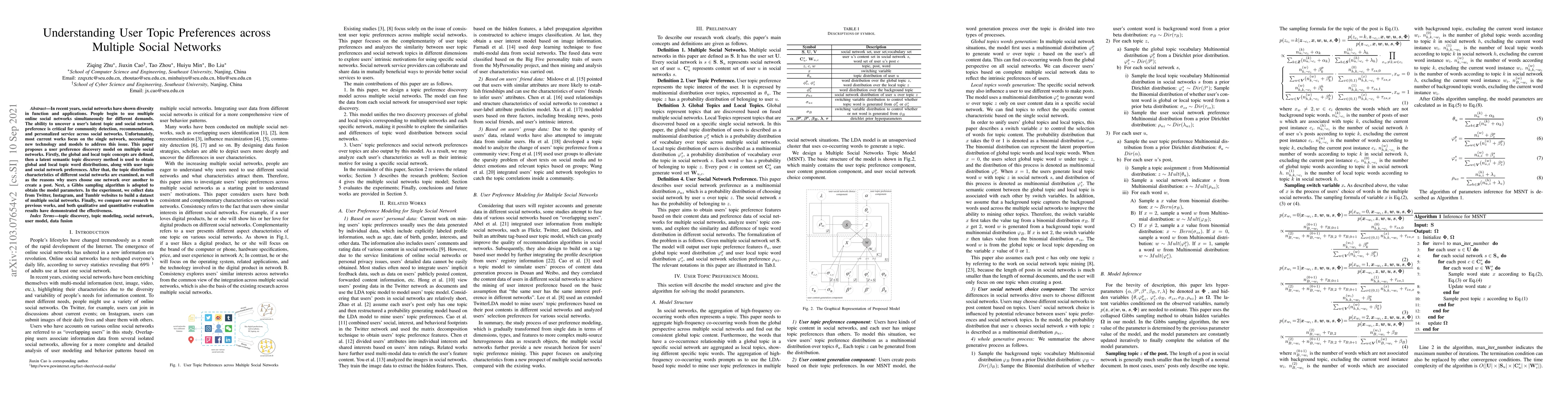 This paper proposes a model to uncover users' latent topic and social network preferences across multiple platforms, using a latent semantic topic discovery method and Gibbs sampling. Experiments on Twitter, Instagram, and Tumblr data show the effectiveness of the model in identifying user topic preferences and reasons for network choice.