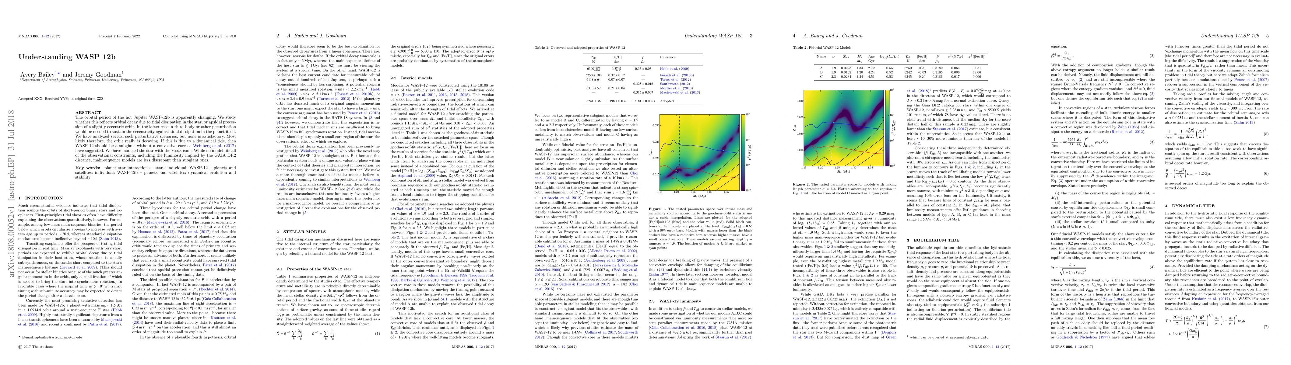 The orbital period of the hot Jupiter WASP-12b is apparently changing. We study whether this reflects orbital decay due to tidal dissipation in the star, or apsidal precession of a slightly eccentric orbit. In the latter case, a third body or other perturbation would be needed to sustain the eccentricity against tidal dissipation in the planet itself. We have analyzed several such perturbative scenarios, but none is satisfactory. Most likely therefore, the orbit really is decaying. If this is due to a dynamical tide, then WASP-12 should be a subgiant without a convective core as Weinberg et al. (2017) have suggested. We have modeled the star with the MESA code. While no model fits all of the observational constraints, including the luminosity implied by the GAIA DR2 distance, main-sequence models are less discrepant than subgiant ones.