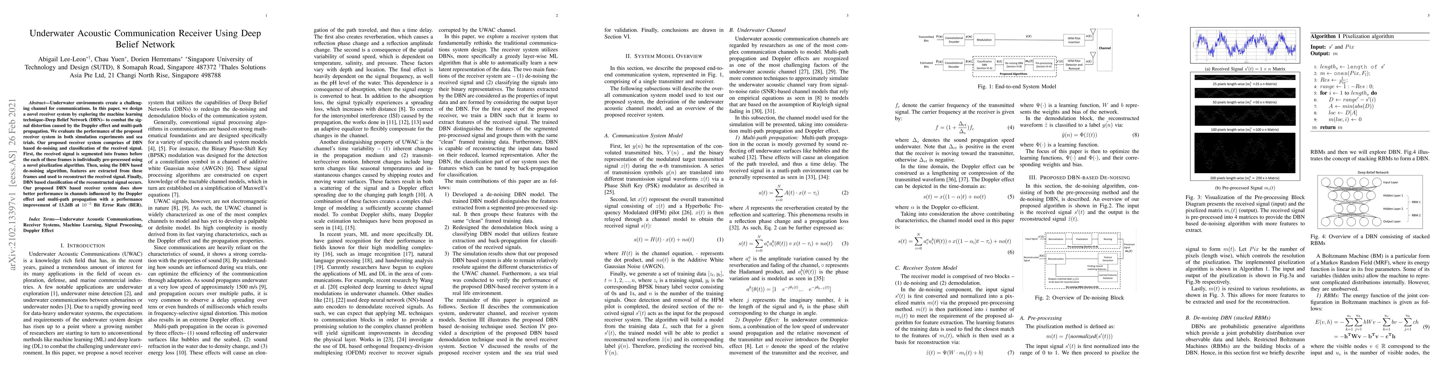 Underwater environments create a challenging channel for communications. In this paper, we design a novel receiver system by exploring the machine learning technique--Deep Belief Network (DBN)-- to combat the signal distortion caused by the Doppler effect and multi-path propagation. We evaluate the performance of the proposed receiver system in both simulation experiments and sea trials. Our proposed receiver system comprises of DBN based de-noising and classification of the received signal. First, the received signal is segmented into frames before the each of these frames is individually pre-processed using a novel pixelization algorithm. Then, using the DBN based de-noising algorithm, features are extracted from these frames and used to reconstruct the received signal. Finally, DBN based classification of the reconstructed signal occurs. Our proposed DBN based receiver system does show better performance in channels influenced by the Doppler effect and multi-path propagation with a performance improvement of 13.2dB at $10^{-3}$ Bit Error Rate (BER).