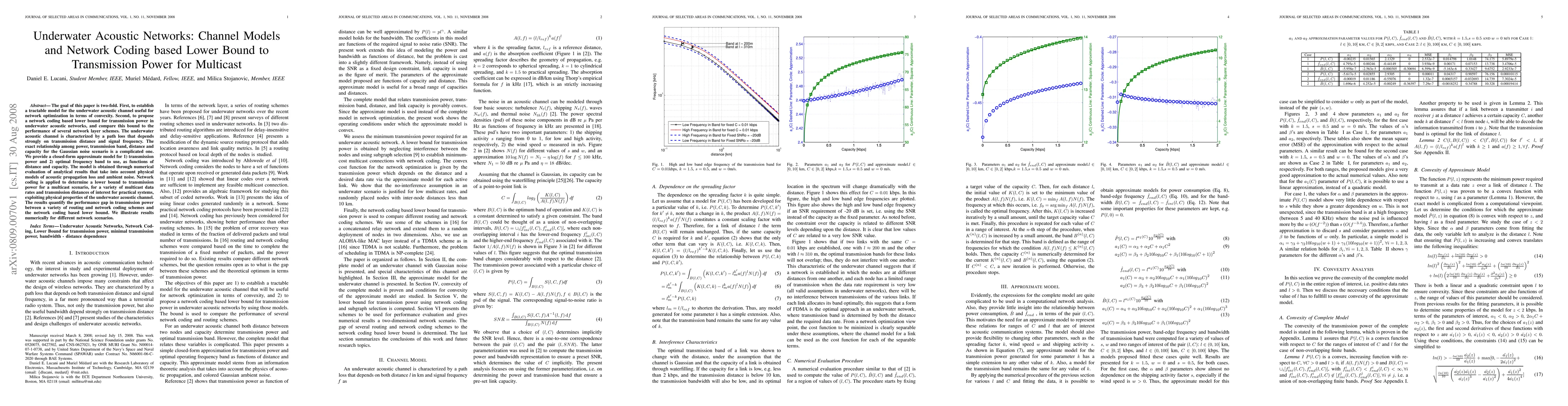 This paper develops a tractable model for underwater acoustic channels to optimize network performance and proposes a network coding-based lower bound for transmission power in multicast scenarios. It provides a closed-form model for transmission power and optimal frequency band, and quantifies the performance gap between various network coding and routing schemes against the proposed lower bound.