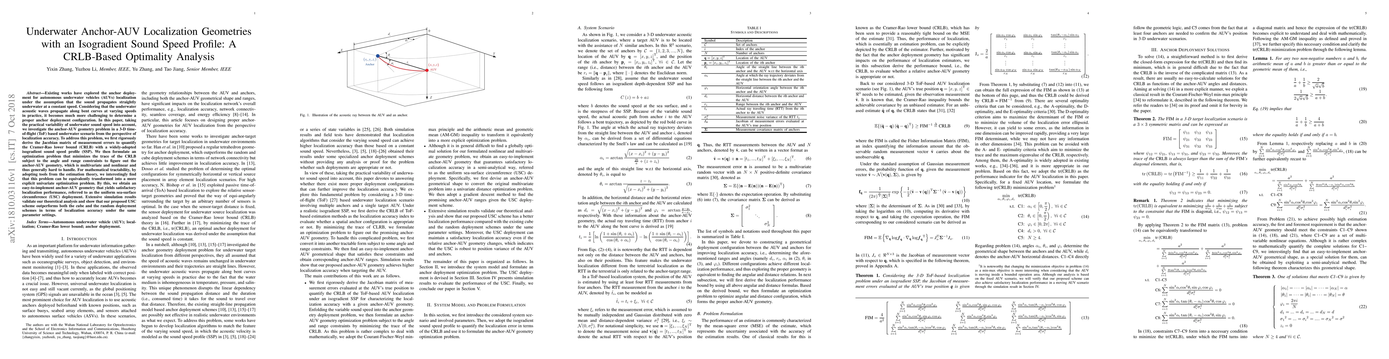 This paper investigates optimal anchor-AUV localization geometries considering variable underwater sound speed, deriving a CRLB to quantify localization accuracy. The proposed uniform sea-surface circumference (USC) deployment scheme, derived from a transformed univariate optimization problem, outperforms cube and random deployment schemes in localization accuracy, as validated by simulations.