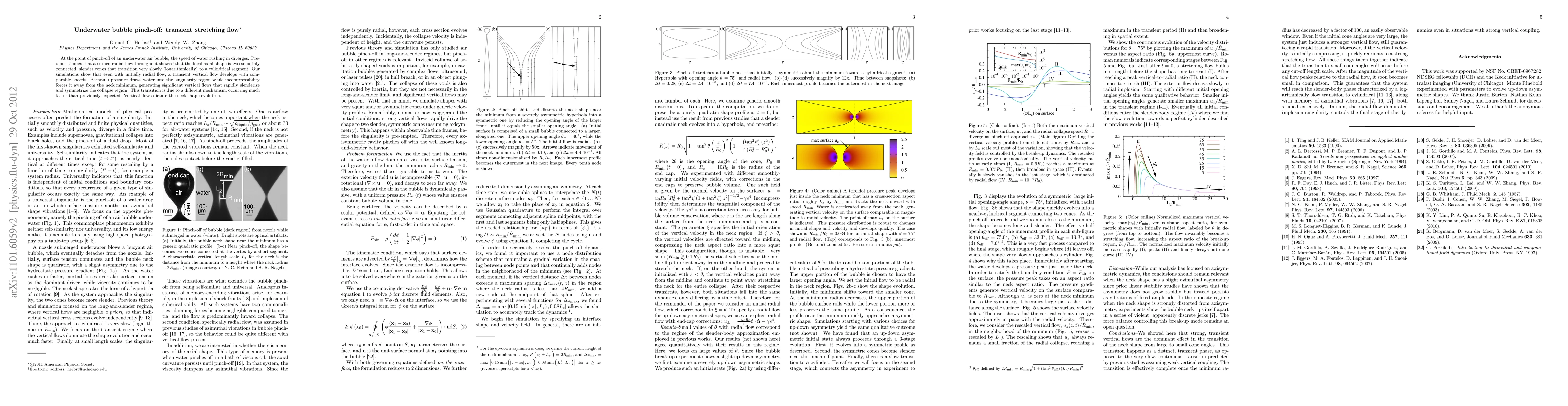 This paper investigates the transient stretching flow during underwater bubble pinch-off, revealing that vertical flows develop rapidly and significantly influence the neck shape evolution, contrasting with previous assumptions of radial flow transitioning slowly. The study highlights the role of Bernoulli pressure and incompressibility in generating these vertical flows.