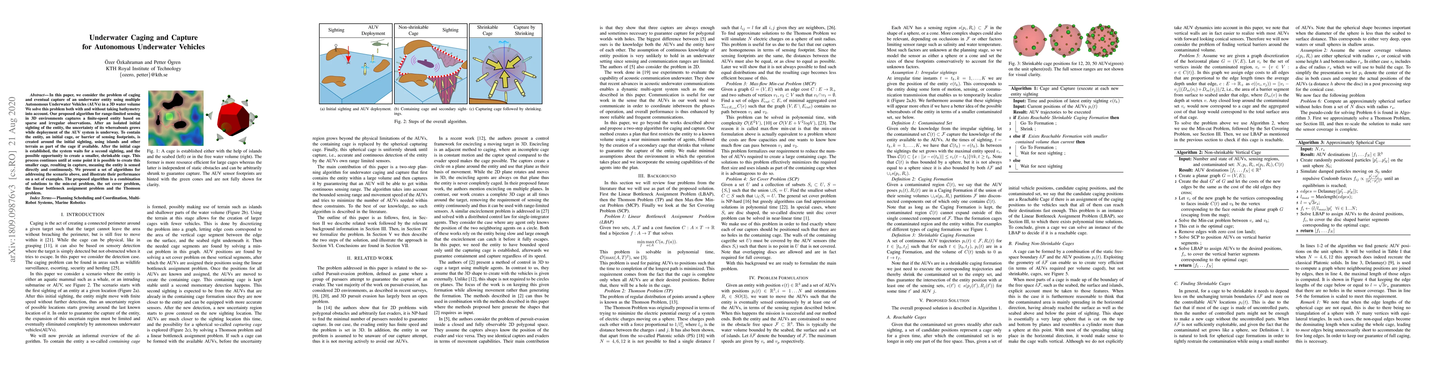 This paper presents an algorithm for autonomous underwater vehicles (AUVs) to cage and capture underwater entities. It considers 3D water volumes with or without bathymetry, using a combination of mathematical problems like min-cut, set cover, linear bottleneck assignment, and Thomson problems. The method involves creating an initial containment area and shrinking it around the entity based on sparse sightings until capture.