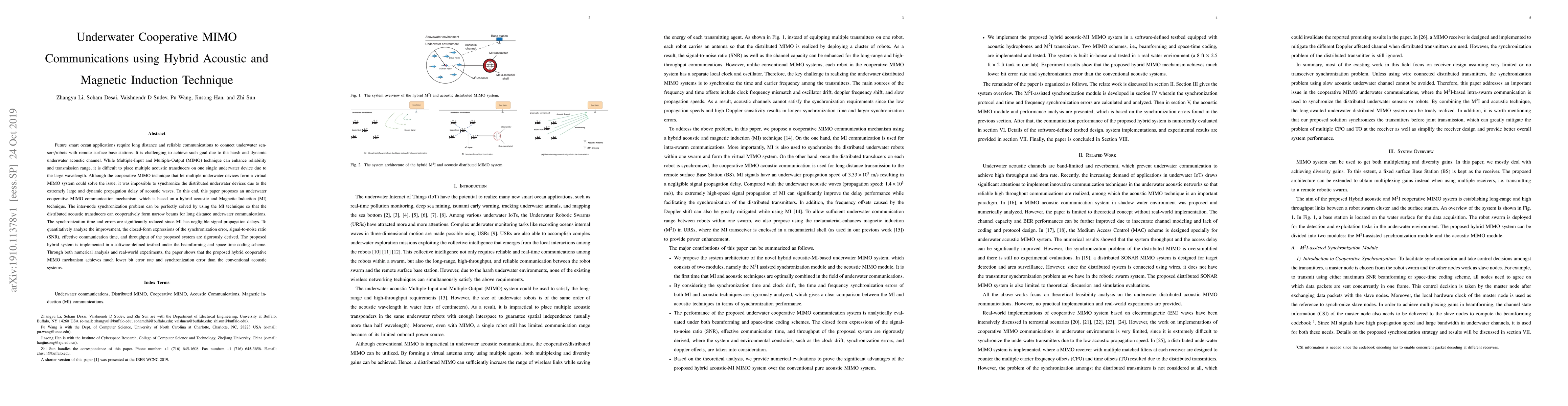This paper proposes an underwater cooperative MIMO communication mechanism using a hybrid acoustic and Magnetic Induction technique to address long-distance communication challenges. The hybrid system effectively reduces synchronization errors and improves communication efficiency by leveraging the negligible propagation delays of Magnetic Induction.