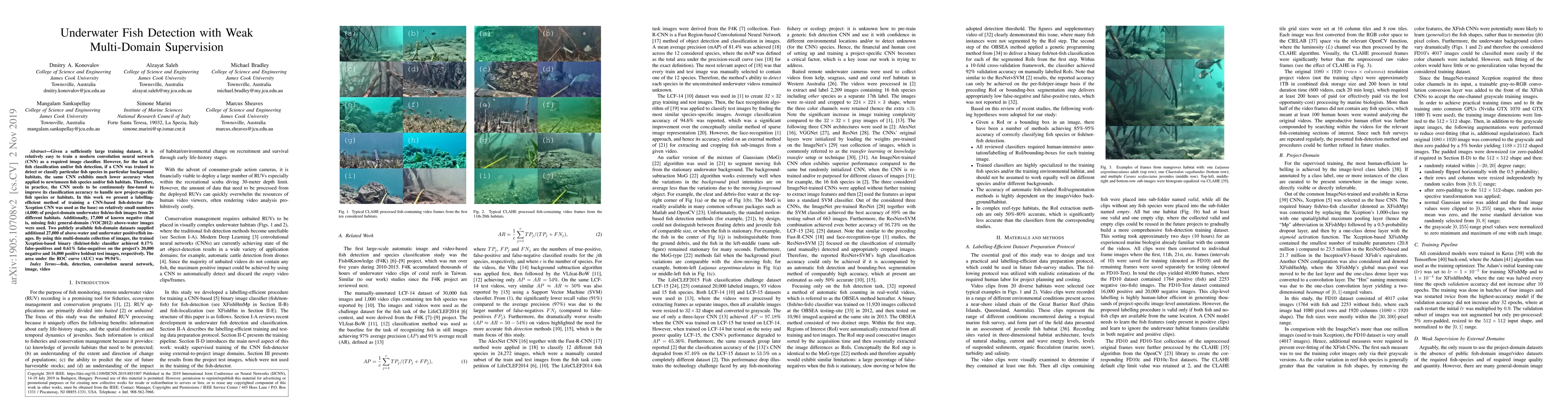 This paper presents a method for training an Xception CNN to detect underwater fish using a limited number of project-specific images and a larger set of general-domain images. The approach achieves high accuracy with 0.17% false-positives and 0.61% false-negatives, and an AUC of 99.94% on test data.