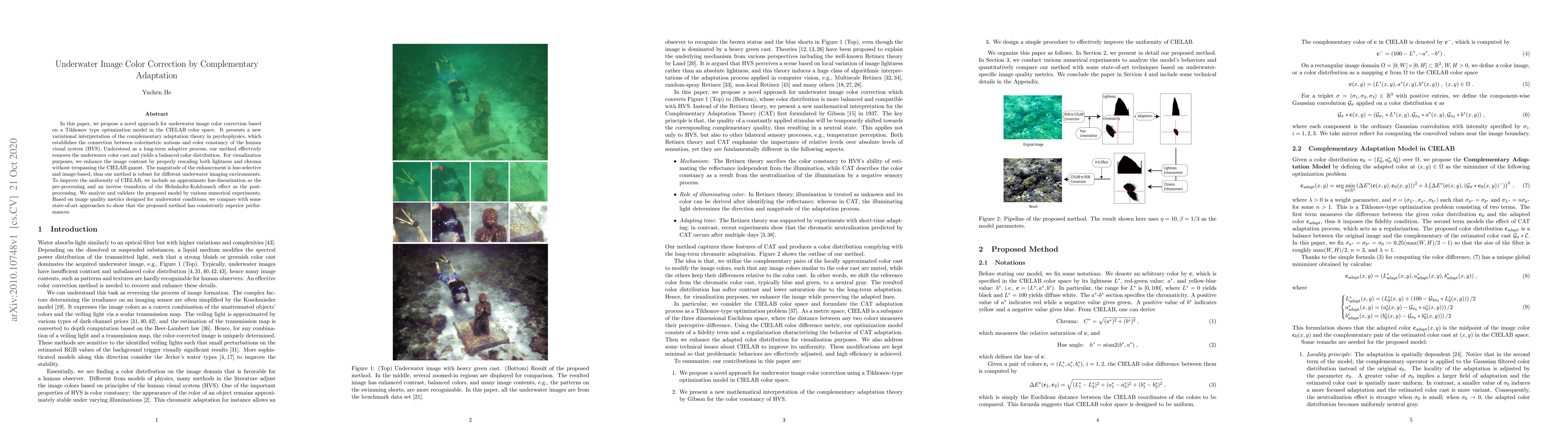 In this paper, we propose a novel approach for underwater image color correction based on a Tikhonov type optimization model in the CIELAB color space. It presents a new variational interpretation of the complementary adaptation theory in psychophysics, which establishes the connection between colorimetric notions and color constancy of the human visual system (HVS). Understood as a long-term adaptive process, our method effectively removes the underwater color cast and yields a balanced color distribution. For visualization purposes, we enhance the image contrast by properly rescaling both lightness and chroma without trespassing the CIELAB gamut. The magnitude of the enhancement is hue-selective and image-based, thus our method is robust for different underwater imaging environments. To improve the uniformity of CIELAB, we include an approximate hue-linearization as the pre-processing and an inverse transform of the Helmholtz-Kohlrausch effect as the post-processing. We analyze and validate the proposed model by various numerical experiments. Based on image quality metrics designed for underwater conditions, we compare with some state-of-art approaches to show that the proposed method has consistently superior performances.