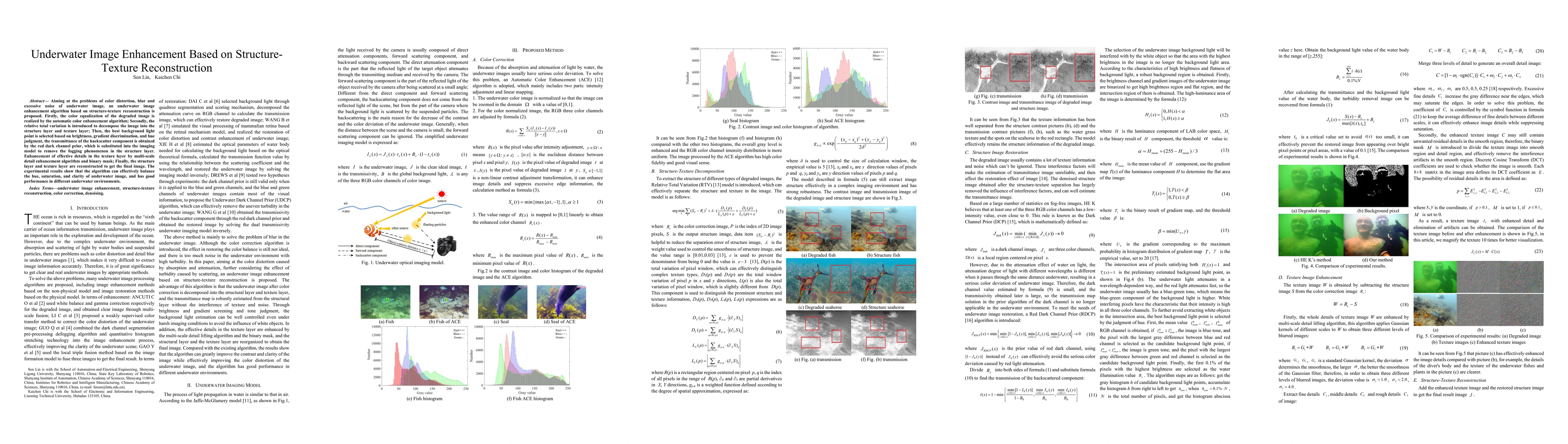 This paper proposes an underwater image enhancement algorithm that addresses color distortion, blur, and noise through structure-texture reconstruction. It uses color equalization, relative total variation decomposition, and multi-scale detail enhancement to reconstruct the image, achieving balanced hue, saturation, and clarity across various underwater environments.