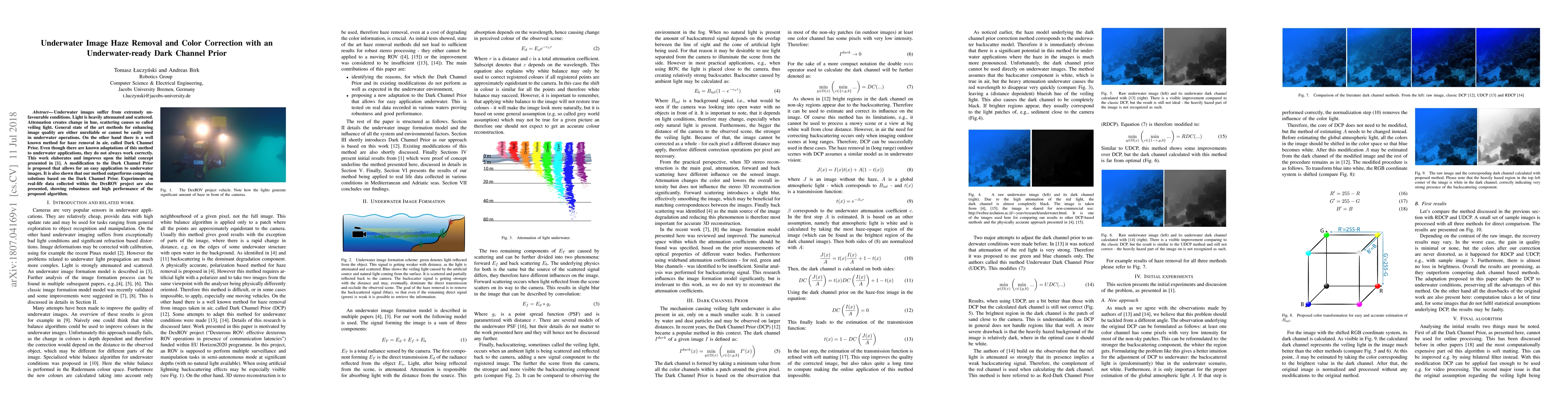Underwater images suffer from extremely unfavourable conditions. Light is heavily attenuated and scattered. Attenuation creates change in hue, scattering causes so called veiling light. General state of the art methods for enhancing image quality are either unreliable or cannot be easily used in underwater operations. On the other hand there is a well known method for haze removal in air, called Dark Channel Prior. Even though there are known adaptations of this method to underwater applications, they do not always work correctly. This work elaborates and improves upon the initial concept presented in [1]. A modification to the Dark Channel Prior is proposed that allows for an easy application to underwater images. It is also shown that our method outperforms competing solutions based on the Dark Channel Prior. Experiments on real-life data collected within the DexROV project are also presented, showing the robustness and high performance of the proposed algorithm.