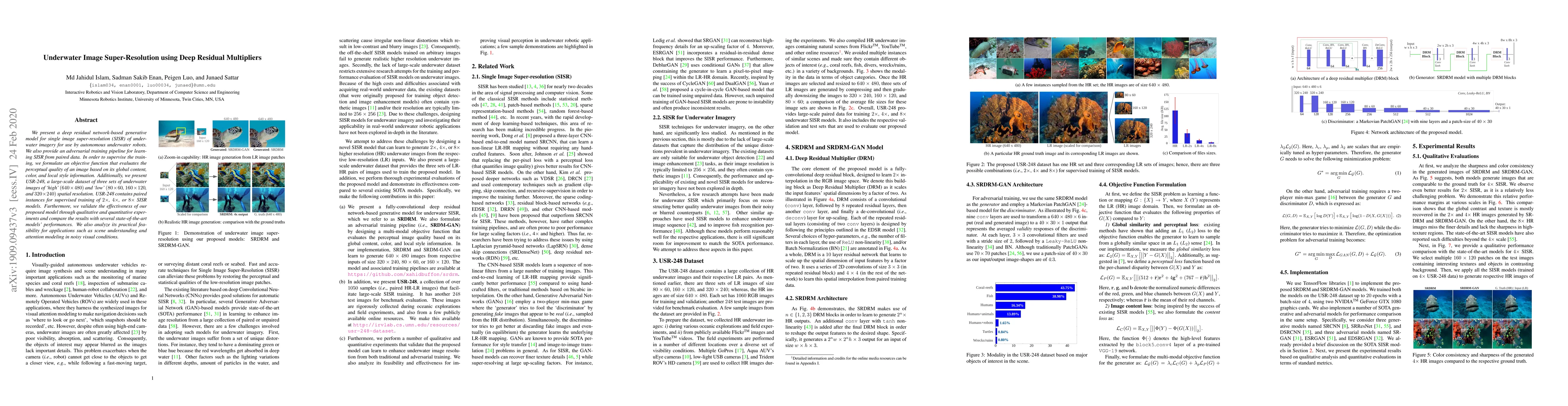 This paper proposes a deep residual network for underwater image super-resolution, utilizing adversarial training and a perceptual quality objective function. It introduces USR-248, a new dataset for training, and demonstrates the model's effectiveness through comparative experiments against state-of-the-art methods.