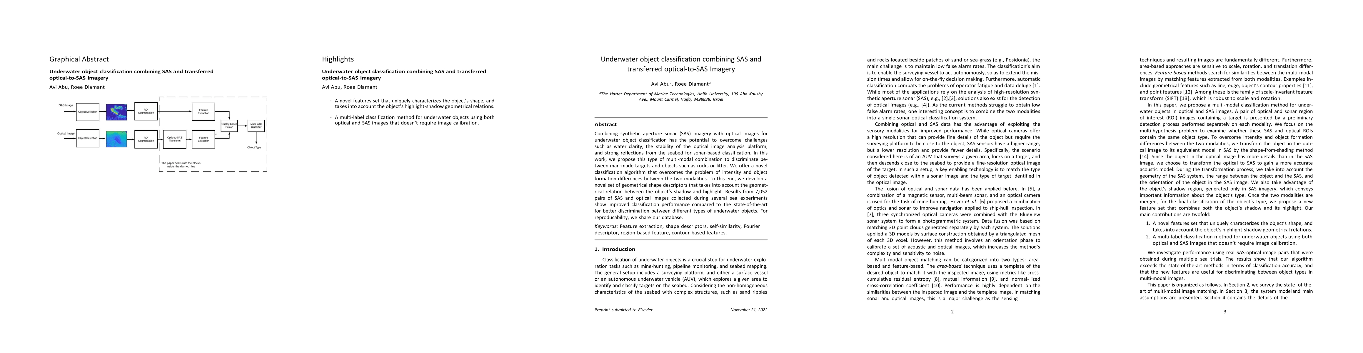 Combining synthetic aperture sonar (SAS) imagery with optical images for underwater object classification has the potential to overcome challenges such as water clarity, the stability of the optical image analysis platform, and strong reflections from the seabed for sonar-based classification. In this work, we propose this type of multi-modal combination to discriminate between man-made targets and objects such as rocks or litter. We offer a novel classification algorithm that overcomes the problem of intensity and object formation differences between the two modalities. To this end, we develop a novel set of geometrical shape descriptors that takes into account the geometrical relation between the objects shadow and highlight. Results from 7,052 pairs of SAS and optical images collected during several sea experiments show improved classification performance compared to the state-of-the-art for better discrimination between different types of underwater objects. For reproducibility, we share our database.
