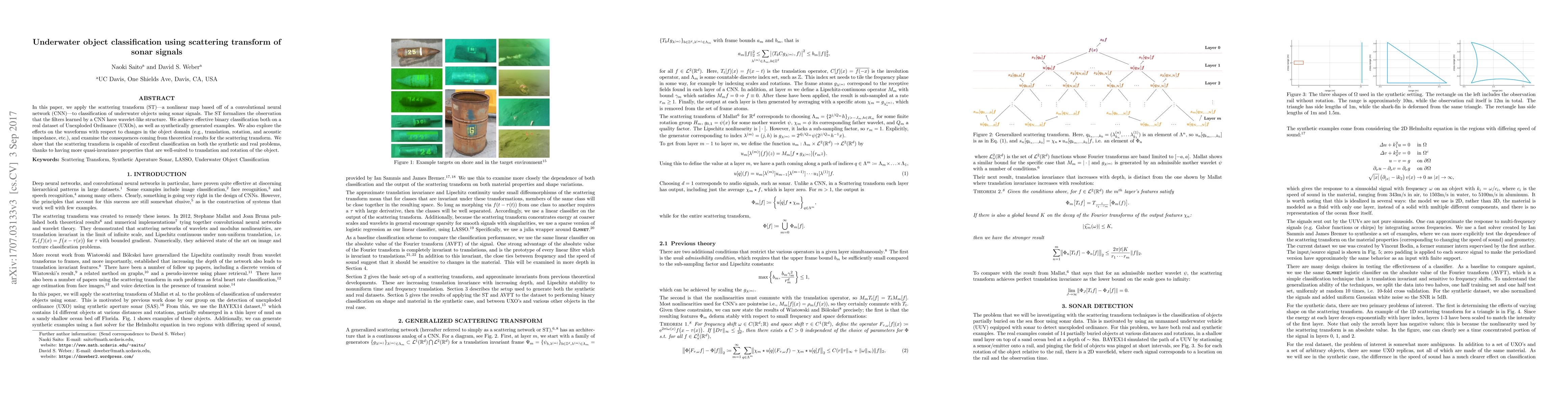 In this paper, we apply the scattering transform (ST), a nonlinear map based off of a convolutional neural network (CNN), to classification of underwater objects using sonar signals. The ST formalizes the observation that the filters learned by a CNN have wavelet like structure. We achieve effective binary classification both on a real dataset of Unexploded Ordinance (UXOs), as well as synthetically generated examples. We also explore the effects on the waveforms with respect to changes in the object domain (e.g., translation, rotation, and acoustic impedance, etc.), and examine the consequences coming from theoretical results for the scattering transform. We show that the scattering transform is capable of excellent classification on both the synthetic and real problems, thanks to having more quasi-invariance properties that are well-suited to translation and rotation of the object.