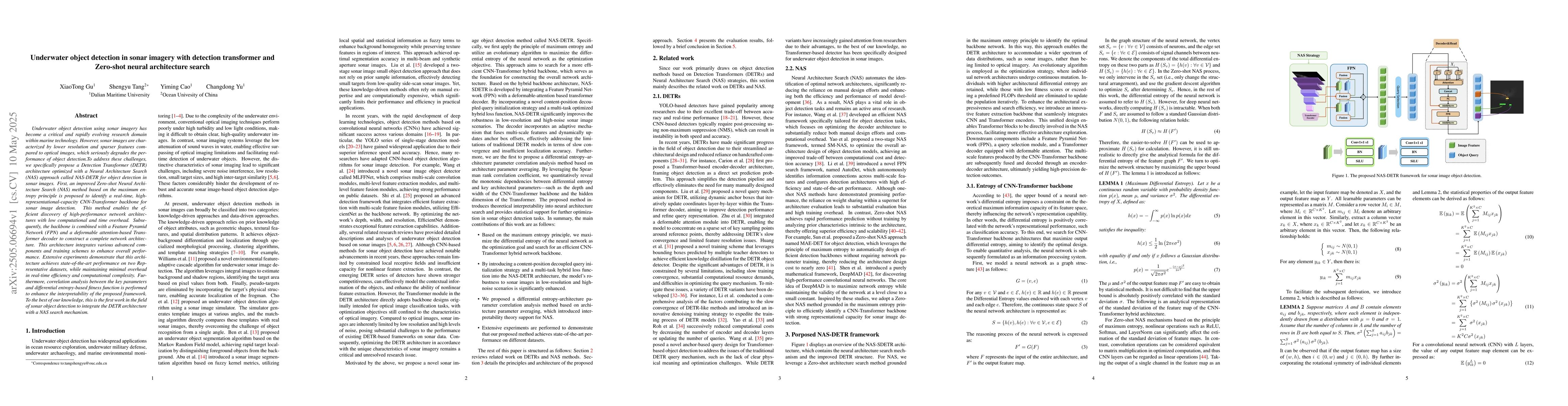 This work is novel as it is the first to combine DETR with a NAS search mechanism for sonar object detection, presenting an improved Zero-shot NAS method based on the maximum entropy principle for discovering high-performance, low-overhead architectures.