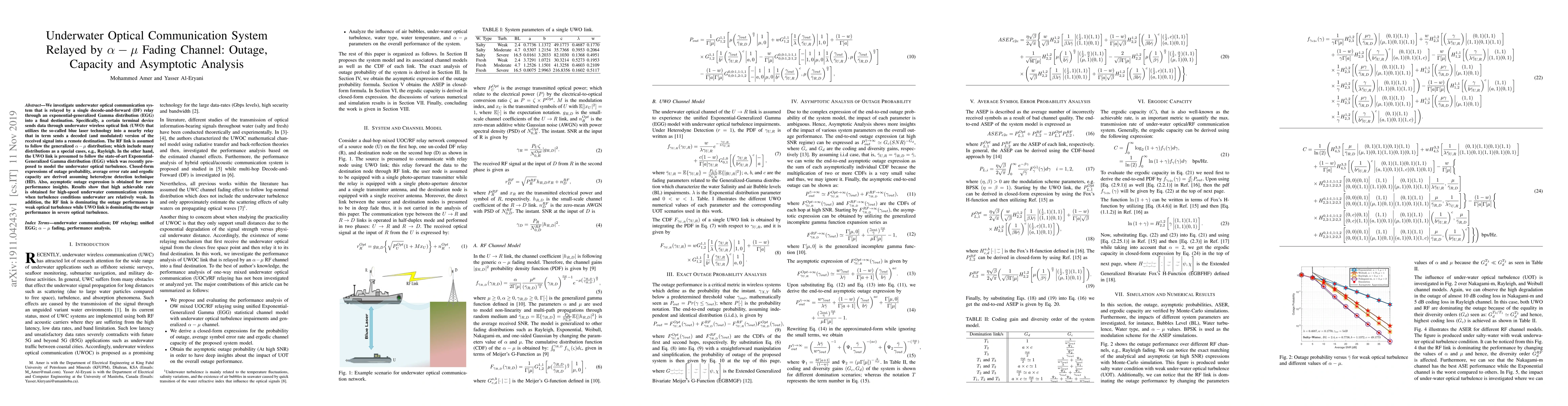 This paper explores an underwater optical communication system using a single decode-and-forward relay through a generalized $\alpha-\mu$ fading channel. It derives closed-form expressions for outage probability, average error rate, and ergodic capacity under heterodyne detection, revealing that the RF link impacts outage performance in weak turbulence while the UWO link dominates in severe turbulence.