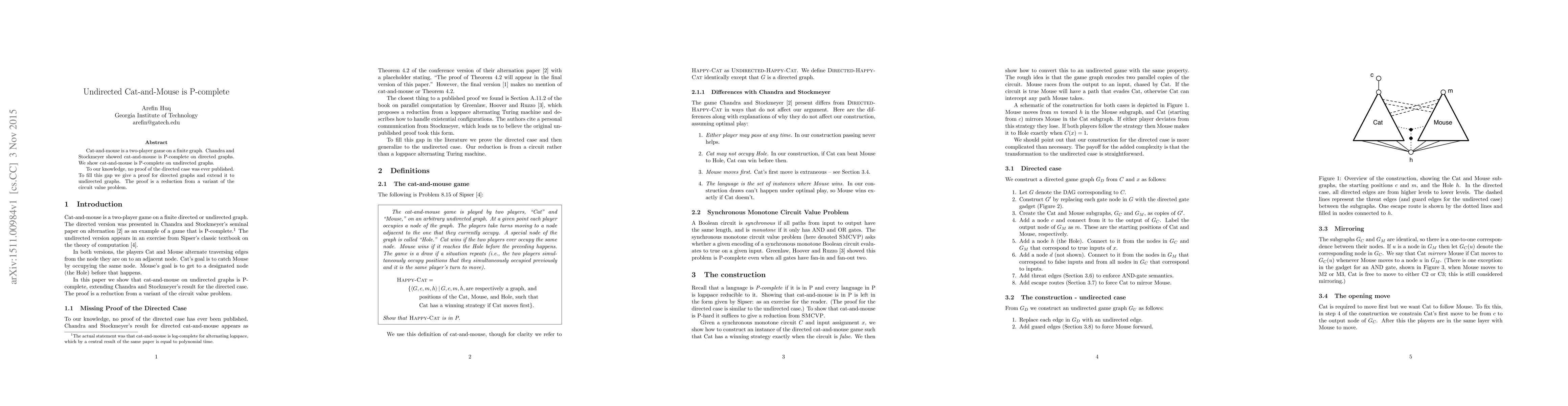 Researchers prove that cat-and-mouse on undirected graphs is P-complete, a problem with no known efficient solution, by reducing it from another well-known computational complexity problem, the circuit value problem.