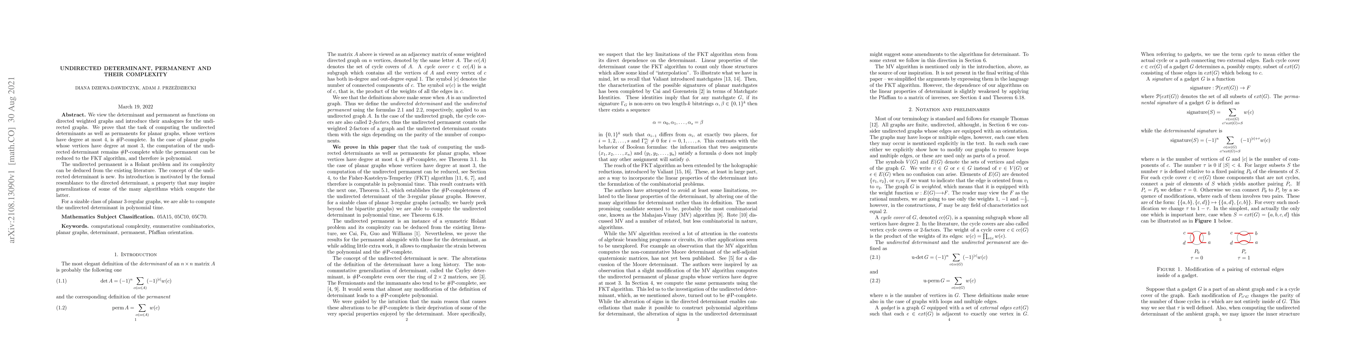 We view the determinant and permanent as functions on directed weighted graphs and introduce their analogues for the undirected graphs. We prove that the task of computing the undirected determinants as well as permanents for planar graphs, whose vertices have degree at most 4, is \#P-complete. In the case of planar graphs whose vertices have degree at most 3, the computation of the undirected determinant remains \#P-complete while the permanent can be reduced to the FKT algorithm, and therefore is polynomial. The undirected permanent is a Holant problem and its complexity can be deduced from the existing literature. The concept of the undirected determinant is new. Its introduction is motivated by the formal resemblance to the directed determinant, a property that may inspire generalizations of some of the many algorithms which compute the latter. For a sizable class of planar 3-regular graphs, we are able to compute the undirected determinant in polynomial time.