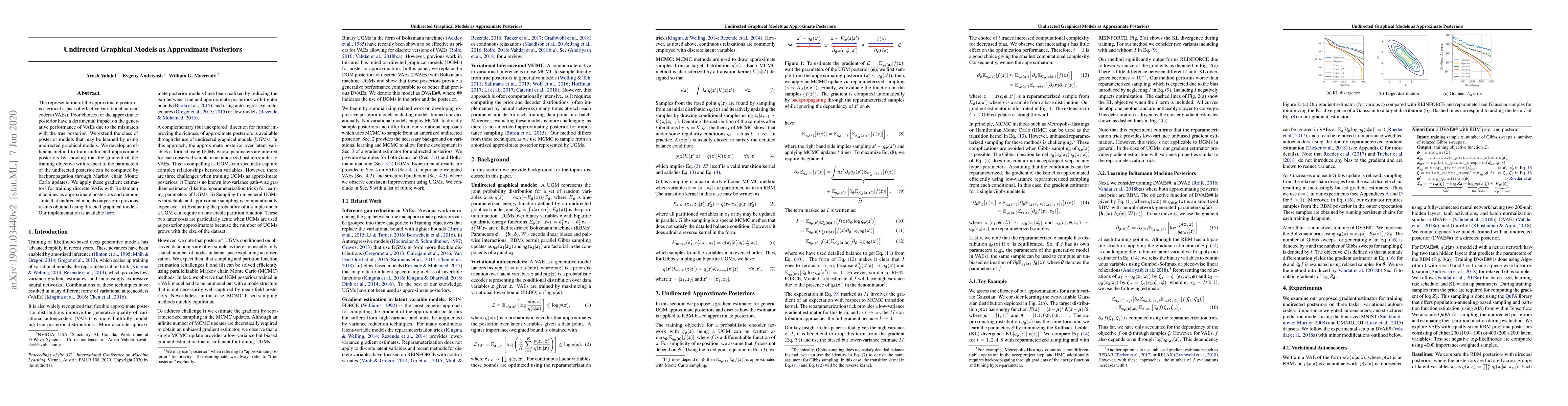 The representation of the approximate posterior is a critical aspect of effective variational autoencoders (VAEs). Poor choices for the approximate posterior have a detrimental impact on the generative performance of VAEs due to the mismatch with the true posterior. We extend the class of posterior models that may be learned by using undirected graphical models. We develop an efficient method to train undirected approximate posteriors by showing that the gradient of the training objective with respect to the parameters of the undirected posterior can be computed by backpropagation through Markov chain Monte Carlo updates. We apply these gradient estimators for training discrete VAEs with Boltzmann machines as approximate posteriors and demonstrate that undirected models outperform previous results obtained using directed graphical models. Our implementation is available at https://github.com/QuadrantAI/dvaess .