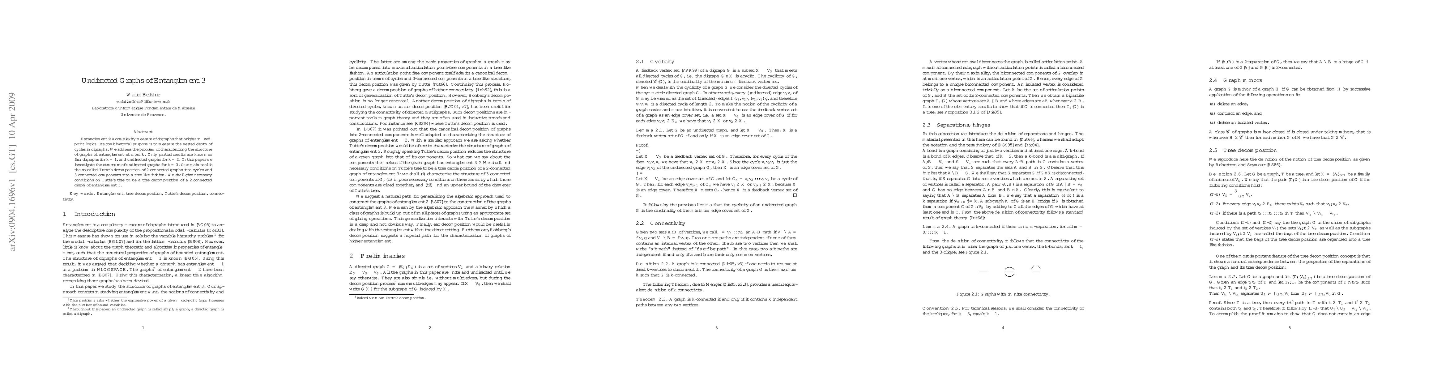 This paper investigates the structure of undirected graphs of entanglement at most 3, employing Tutte's decomposition method. It provides necessary conditions for Tutte's tree to decompose 2-connected graphs with entanglement level 3.