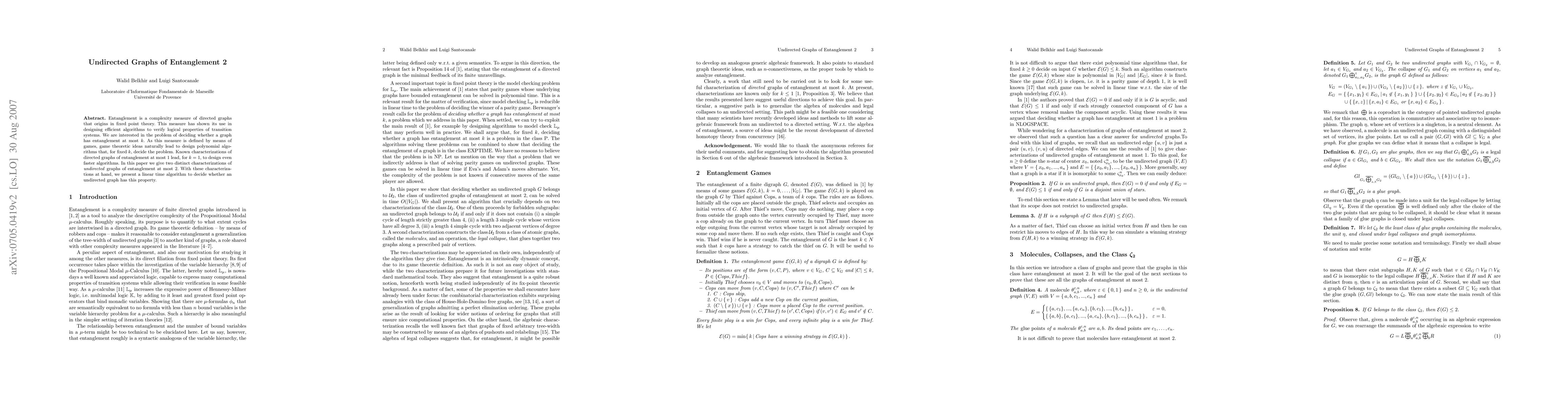 This paper characterizes undirected graphs of entanglement at most 2, providing a linear time algorithm to determine if a graph possesses this property. The characterization leverages game theoretic insights to efficiently solve the problem.