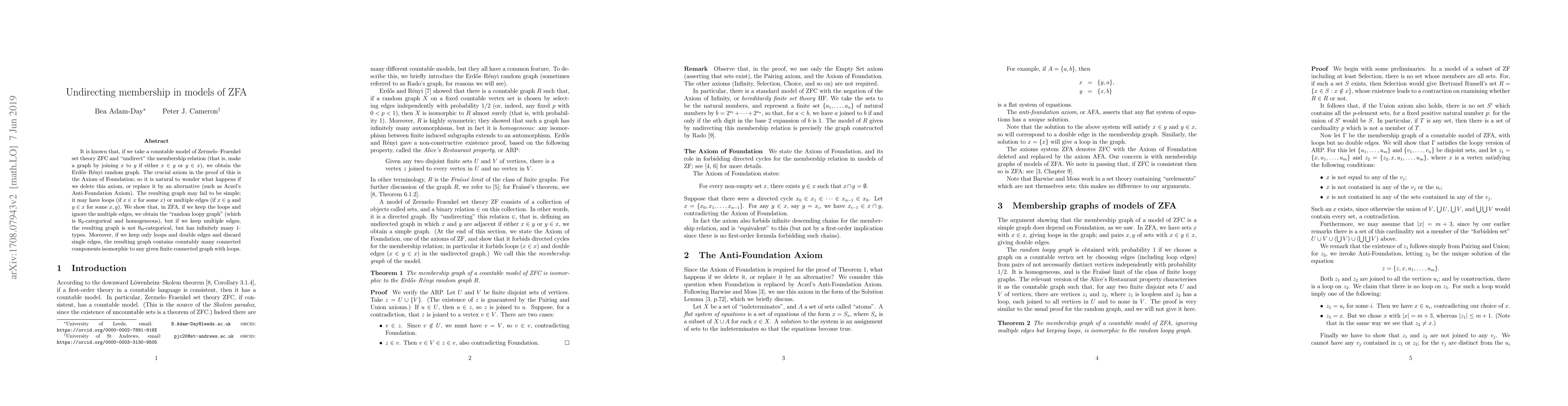 It is known that, if we take a countable model of Zermelo--Fraenkel set theory ZFC and "undirect" the membership relation (that is, make a graph by joining $x$ to $y$ if either $x\in y$ or $y\in x$), we obtain the Erd\H{o}s--R\'enyi random graph. The crucial axiom in the proof of this is the Axiom of Foundation, so it is natural to wonder what happens if we delete this axiom, or replace it by an alternative (such as Aczel's Anti-Foundation Axiom). The resulting graph may fail to be simple, it may have loops (if $x\in x$ for some $x$) or multiple edges (if $x\in y$ and $y\in x$ for some $x,y$). We show that, in ZFA, if we keep the loops and ignore the multiple edges, we obtain the "random loopy graph" (which is $\aleph_0$-categorical and homogeneous), but if we keep multiple edges, the resulting graph is not $\aleph_0$-categorical, but has infinitely many $1$-types. Moreover, if we keep only loops and double edges and discard single edges, the resulting graph contains countably many connected components isomorphic to any given finite connected graph with loops.
