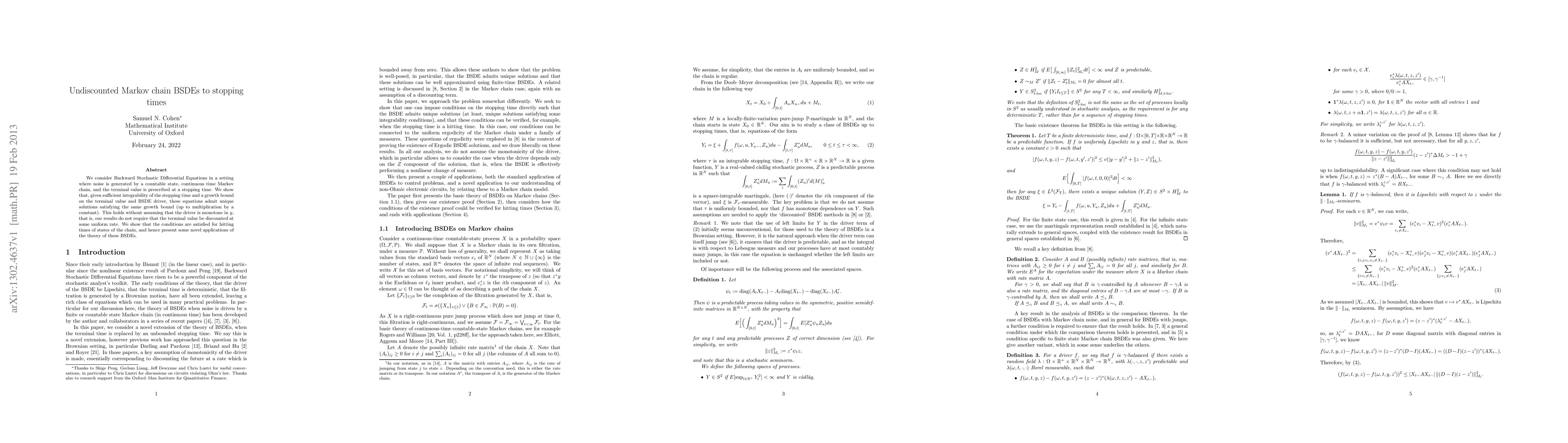 We consider Backward Stochastic Differential Equations in a setting where noise is generated by a countable state, continuous time Markov chain, and the terminal value is prescribed at a stopping time. We show that, given sufficient integrability of the stopping time and a growth bound on the terminal value and BSDE driver, these equations admit unique solutions satisfying the same growth bound (up to multiplication by a constant). This holds without assuming that the driver is monotone in y, that is, our results do not require that the terminal value be discounted at some uniform rate. We show that the conditions are satisfied for hitting times of states of the chain, and hence present some novel applications of the theory of these BSDEs.