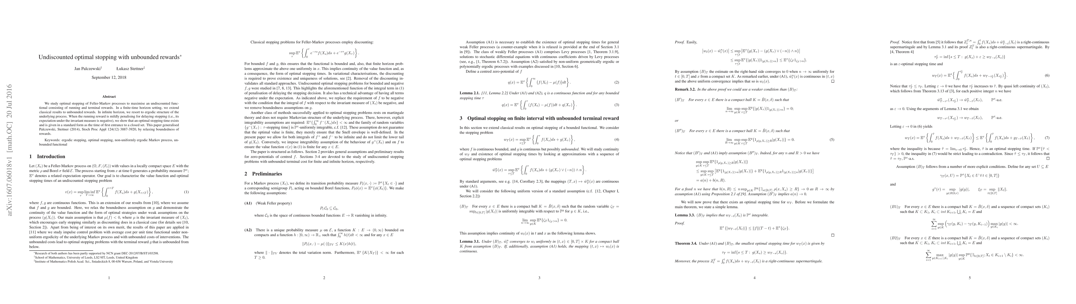 This paper extends optimal stopping theory for Feller-Markov processes to handle unbounded rewards, proving the existence of optimal stopping times under certain conditions. It generalises previous results by allowing for unbounded rewards and provides a standard form for the optimal stopping time.