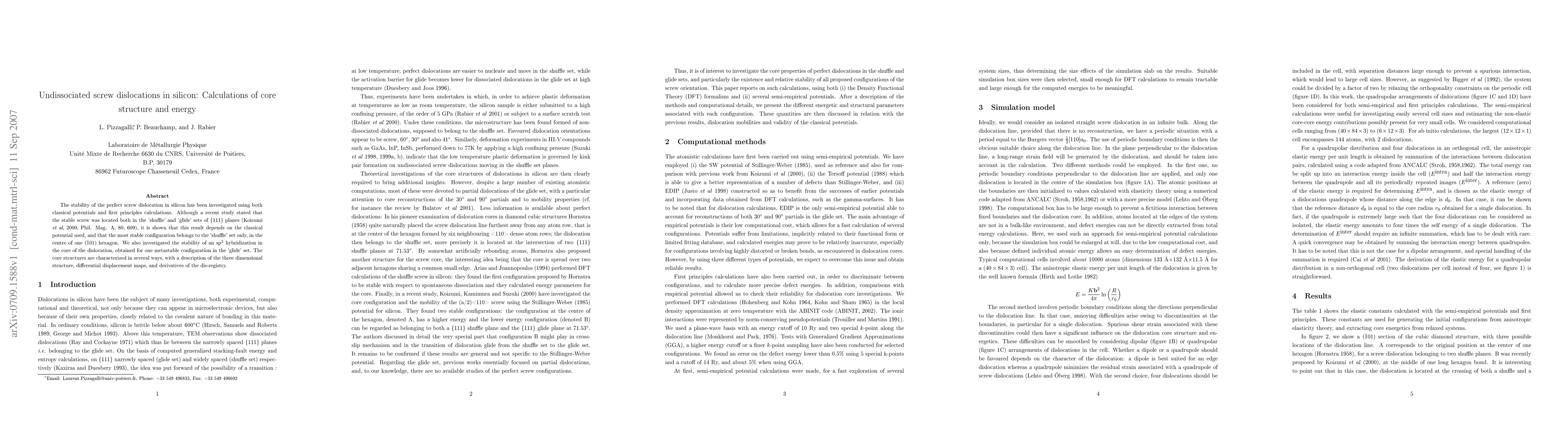 Research investigates screw dislocations in silicon, finding that a stable configuration exists only in one type of plane configuration, with a unique core structure that can exhibit sp2 hybridization.