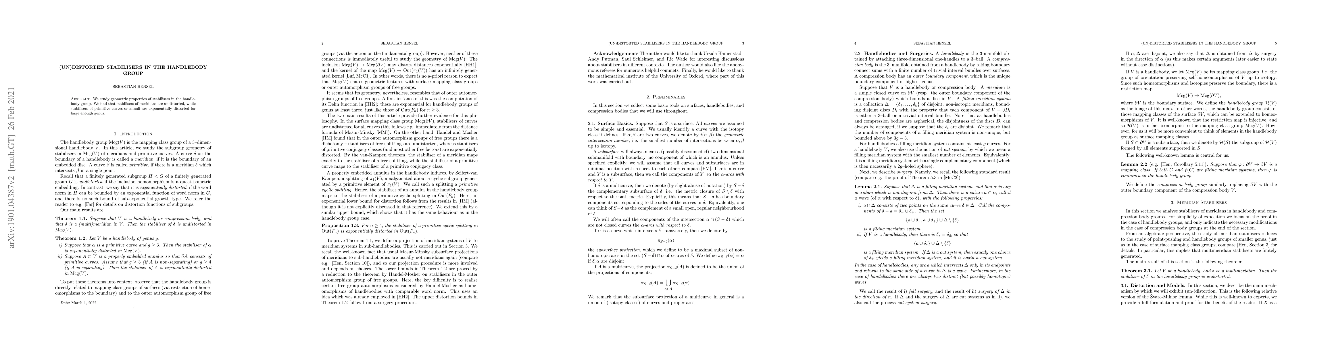 Summary: This paper investigates the geometric properties of stabilisers within the handlebody group, revealing that meridian stabilisers remain undistorted, whereas stabilisers of primitive curves or annuli exhibit exponential distortion as genus increases.