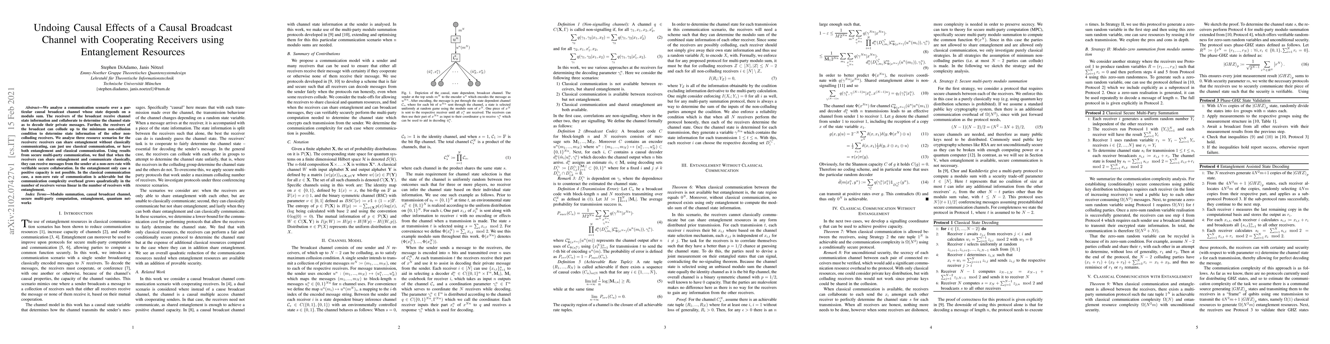 We analyse a communication scenario over a particular causal broadcast channel whose state depends on a modulo sum. The receivers of the broadcast receive channel state information and collaborate to determine the channel state as to decode their private messages. Further, the receivers of the broadcast can collude up to the minimum non-collusion condition to determine state information of the other non-colluding receivers. We analyse three resource scenarios for the receivers: receivers can share entanglement without classically communicating, can just use classical communication, or have both entanglement and classical communication. Using results from secure multi-party communication, we find that when the receivers can share entanglement and communicate classically, they can receive messages from the sender at a non-zero rate with verifiable secure collaboration. In the entanglement only case a positive capacity is not possible. In the classical communication case, a non-zero rate of communication is achievable but the communication complexity overhead grows quadratically in the number of receivers versus linear in the number of receivers with entanglement.