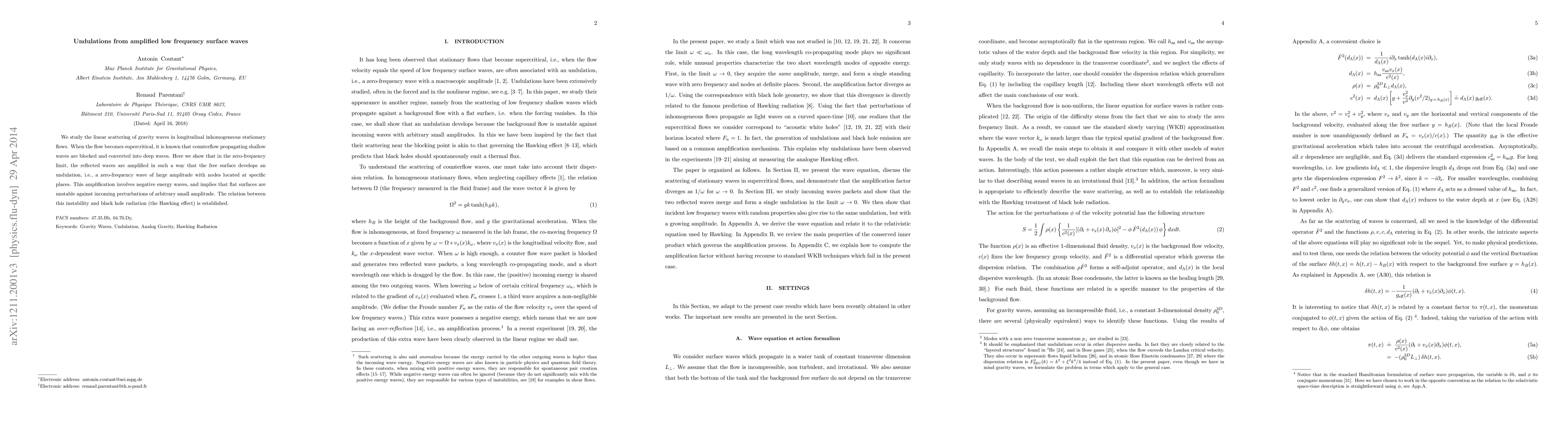 We study the scattering of gravity waves in longitudinal inhomogeneous stationary flows. When the flow becomes supercritical, counterflow propagating shallow waves are blocked and converted into deep waves. We show that the reflected waves are amplified in such a way that, in the zero-frequency limit, the free surface develops an undulation, i.e., a zero-frequency wave of large amplitude with nodes located at specific places. This amplification involves negative energy waves, and implies that the unperturbed flat surface is unstable against incoming perturbations of arbitrary small amplitude. The relation between this instability and black hole radiation (the Hawking effect) is discussed.
