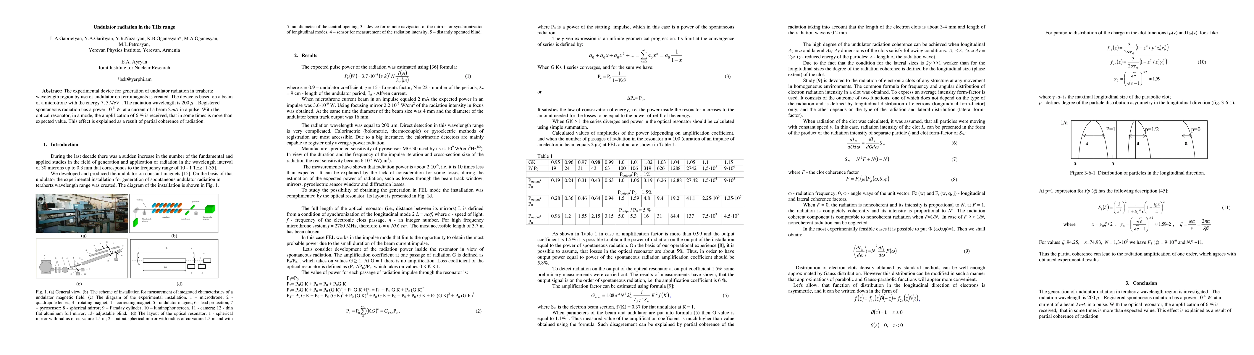 The experimental device for generation of undulator radiation in terahertz wavelength region by use of undulator on ferromagnets is created. The device is based on a beam of a microtrone with the energy 7.5 MeV. The radiation wavelength is 200 micron. Registered spontaneous radiation has a power of 10 microwatt at a current of a beam 2 mA in a pulse. With the optical resonator, in a mode, the amplification of 6 percent is received, that in some times is more than expected value. This effect is explained as a result of partial coherence of radiation.