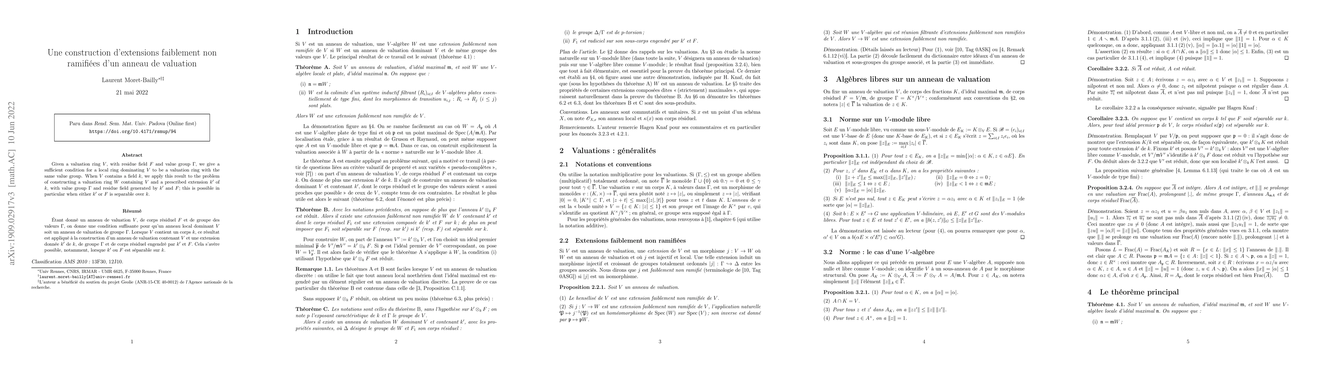 \'Etant donn\'e un anneau de valuation $V$, de corps r\'esiduel $F$ et de groupe des valeurs $\Gamma$, on donne une condition suffisante pour qu'un anneau local dominant $V$ soit un anneau de valuation de groupe $\Gamma$. Lorsque $V$ contient un corps $k$, ce r\'esultat est appliqu\'e \`a la construction d'un anneau de valuation contenant $V$ et une extension donn\'ee $k'$ de $k$, de groupe $\Gamma$ et de corps r\'esiduel engendr\'e par $k'$ et $F$. Cela s'av\`ere possible, notamment, lorsque $k'$ ou $F$ est s\'eparable sur $k$. Given a valuation ring $V$, with residue field $F$ and value group $\Gamma$, we give a sufficient condition for a local ring dominating $V$ to be a valuation ring with the same value group. When $V$ contains a field $k$, we apply this result to the problem of constructing a valuation ring $W$ containing $V$ and a prescribed extension $k'$ of $k$, with value group $\Gamma$ and residue field generated by $k'$ and $F$; this is possible in particular when either $k'$ or $F$ is separable over $k$.