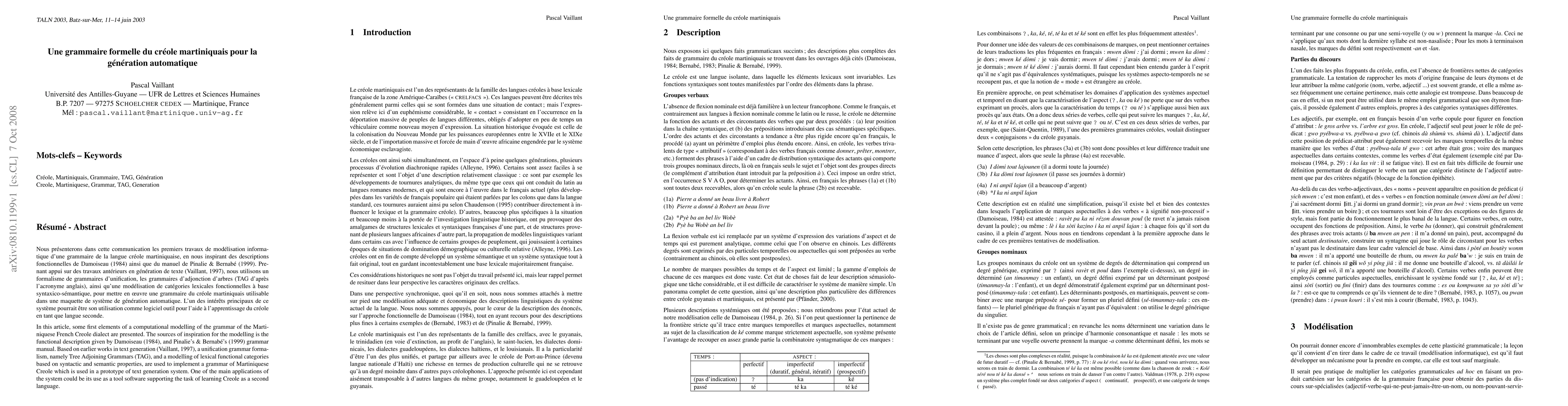 In this article, some first elements of a computational modelling of the grammar of the Martiniquese French Creole dialect are presented. The sources of inspiration for the modelling is the functional description given by Damoiseau (1984), and Pinalie's & Bernabe's (1999) grammar manual. Based on earlier works in text generation (Vaillant, 1997), a unification grammar formalism, namely Tree Adjoining Grammars (TAG), and a modelling of lexical functional categories based on syntactic and semantic properties, are used to implement a grammar of Martiniquese Creole which is used in a prototype of text generation system. One of the main applications of the system could be its use as a tool software supporting the task of learning Creole as a second language. -- Nous pr\'esenterons dans cette communication les premiers travaux de mod\'elisation informatique d'une grammaire de la langue cr\'eole martiniquaise, en nous inspirant des descriptions fonctionnelles de Damoiseau (1984) ainsi que du manuel de Pinalie & Bernab\'e (1999). Prenant appui sur des travaux ant\'erieurs en g\'en\'eration de texte (Vaillant, 1997), nous utilisons un formalisme de grammaires d'unification, les grammaires d'adjonction d'arbres (TAG d'apr\`es l'acronyme anglais), ainsi qu'une mod\'elisation de cat\'egories lexicales fonctionnelles \`a base syntaxico-s\'emantique, pour mettre en oeuvre une grammaire du cr\'eole martiniquais utilisable dans une maquette de syst\`eme de g\'en\'eration automatique. L'un des int\'er\^ets principaux de ce syst\`eme pourrait \^etre son utilisation comme logiciel outil pour l'aide \`a l'apprentissage du cr\'eole en tant que langue seconde.