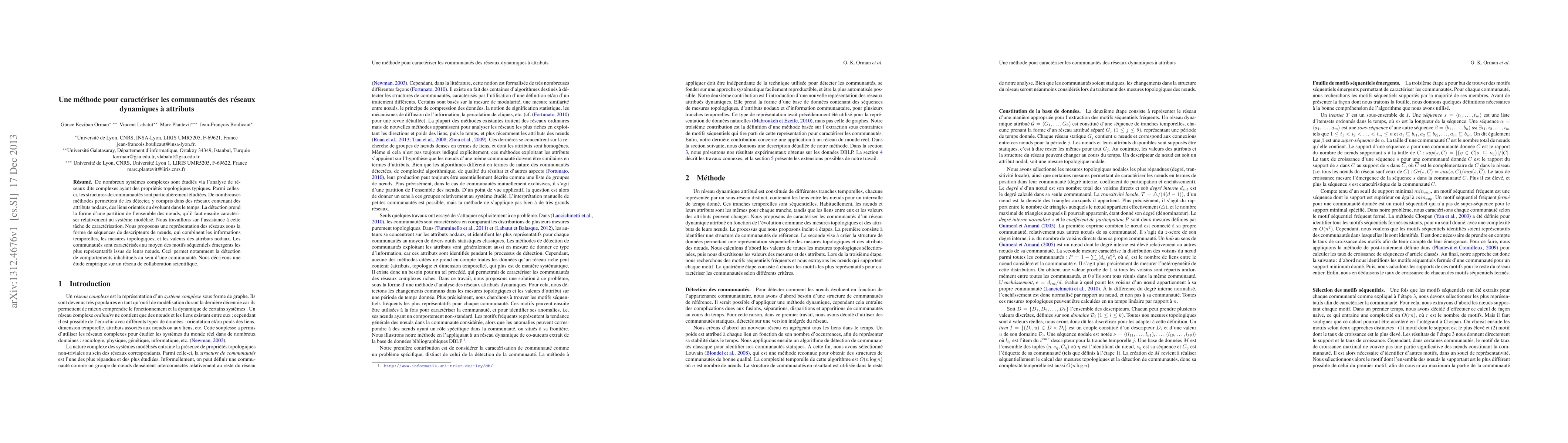 Many complex systems are modeled through complex networks whose analysis reveals typical topological properties. Amongst those, the community structure is one of the most studied. Many methods are proposed to detect communities, not only in plain, but also in attributed, directed or even dynamic networks. A community structure takes the form of a partition of the node set, which must then be characterized relatively to the properties of the studied system. We propose a method to support such a characterization task. We define a sequence-based representation of networks, combining temporal information, topological measures, and nodal attributes. We then characterize communities using the most representative emerging sequential patterns of its nodes. This also allows detecting unusual behavior in a community. We describe an empirical study of a network of scientific collaborations.---De nombreux syst\`emes complexes sont \'etudi\'es via l'analyse de r\'eseaux dits complexes ayant des propri\'et\'es topologiques typiques. Parmi cellesci, les structures de communaut\'es sont particuli\`erement \'etudi\'ees. De nombreuses m\'ethodes permettent de les d\'etecter, y compris dans des r\'eseaux contenant des attributs nodaux, des liens orient\'es ou \'evoluant dans le temps. La d\'etection prend la forme d'une partition de l'ensemble des noeuds, qu'il faut ensuite caract\'eriser relativement au syst\`eme mod\'elis\'e. Nous travaillons sur l'assistance \`a cette t\^ache de caract\'erisation. Nous proposons une repr\'esentation des r\'eseaux sous la forme de s\'equences de descripteurs de noeuds, qui combinent les informations temporelles, les mesures topologiques, et les valeurs des attributs nodaux. Les communaut\'es sont caract\'eris\'ees au moyen des motifs s\'equentiels \'emergents les plus repr\'esentatifs issus de leurs noeuds. Ceci permet notamment la d\'etection de comportements inhabituels au sein d'une communaut\'e. Nous d\'ecrivons une \'etude empirique sur un r\'eseau de collaboration scientifique.