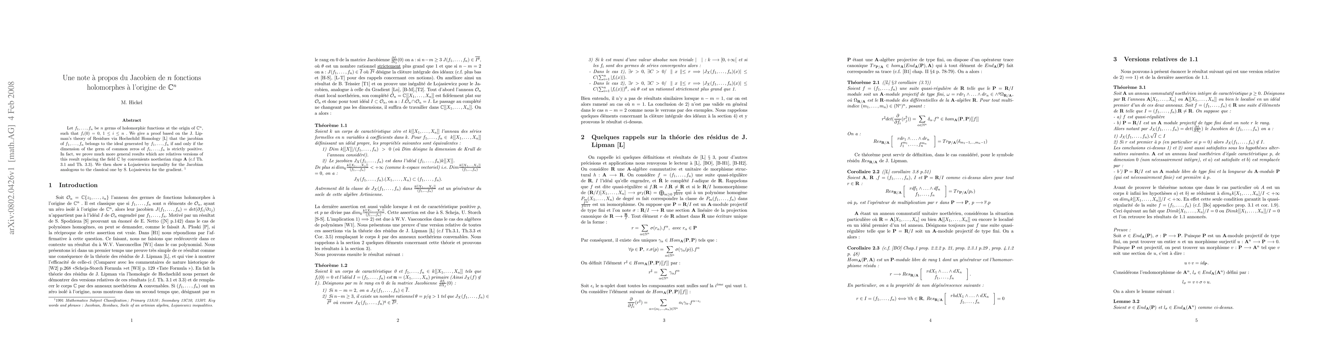 This paper proves that the Jacobian of $n$ holomorphic functions at the origin of $\mathbb{C}^n$ lies in the ideal generated by these functions if and only if the dimension of their common zero set is strictly positive, using J. Lipman's theory. It also extends these results to noetherian rings and provides a \L ojasiewicz inequality for the Jacobian.