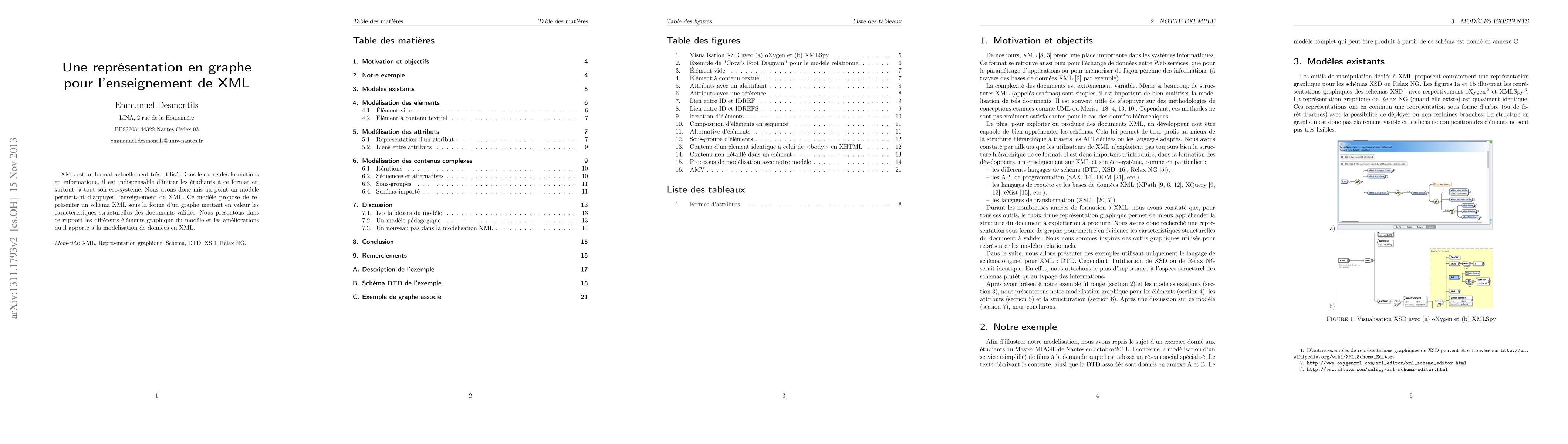 Currently, XML is a format widely used. In the context of computer science teaching, it is necessary to introduce students to this format and, especially, at its eco-system. We have developed a model to support the teaching of XML. We propose to represent an XML schema as a graph highlighting the structural characteristics of the valide documents. We present in this report different graphic elements of the model and the improvements it brings to data modeling in XML.---XML est un format actuellement tr\`es utilis\'e. Dans le cadre des formations en informatique, il est indispensable d'initier les \'etudiants \`a ce format et, surtout, \`a tout son \'eco-syst\`eme. Nous avons donc mis au point un mod\`ele permettant d'appuyer l'enseignement de XML. Ce mod\`ele propose de repr\'esenter un sch\'ema XML sous la forme d'un graphe mettant en valeur les caract\'eristiques structurelles des documents valides. Nous pr\'esentons dans ce rapport les diff\'erents \'el\'ements graphique du mod\`ele et les am\'eliorations qu'il apporte \`a la mod\'elisation de donn\'ees en XML.