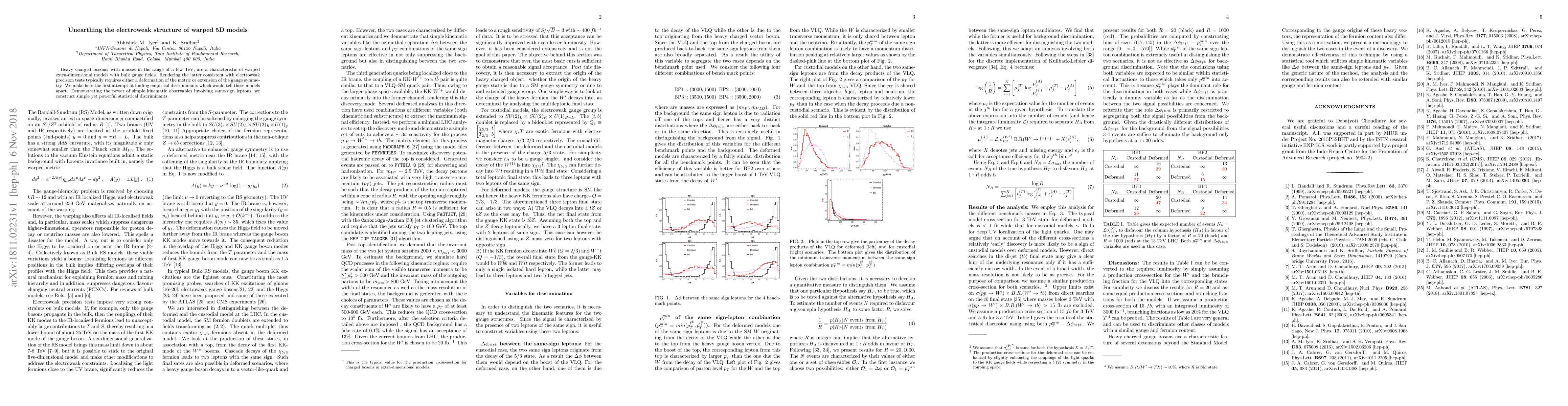 This paper explores the electroweak properties of warped 5D models featuring heavy charged bosons, aiming to identify empirical discriminants that can distinguish these models. It introduces statistical discriminants based on kinematic observables involving same-sign leptons to differentiate between various theoretical frameworks.