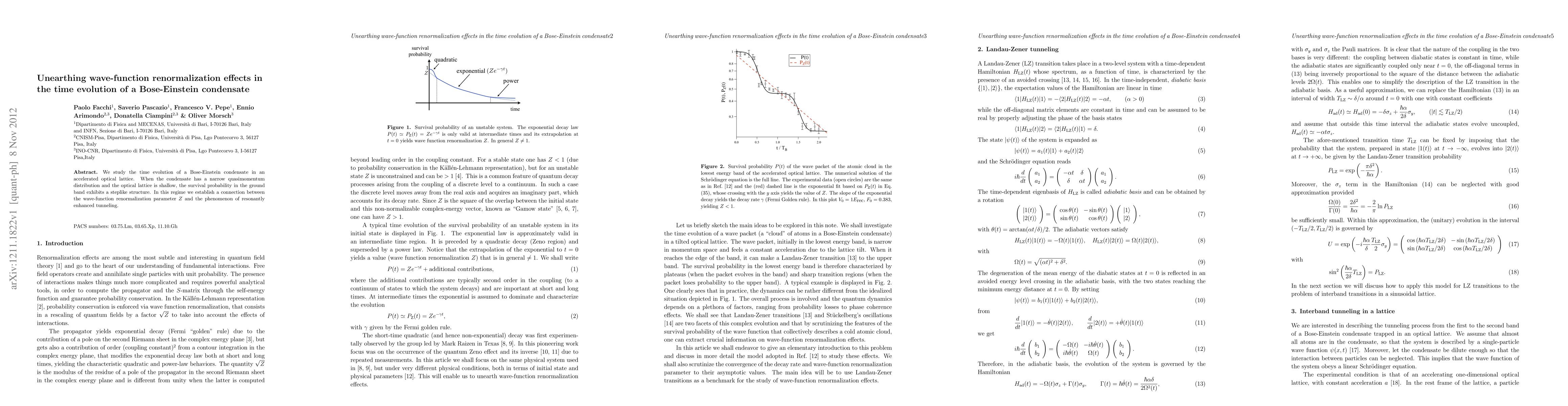 Researchers study time evolution of a Bose-Einstein condensate in an accelerated optical lattice, finding a connection between wave-function renormalization and resonantly enhanced tunneling in a shallow, narrow quasimomentum distribution regime.