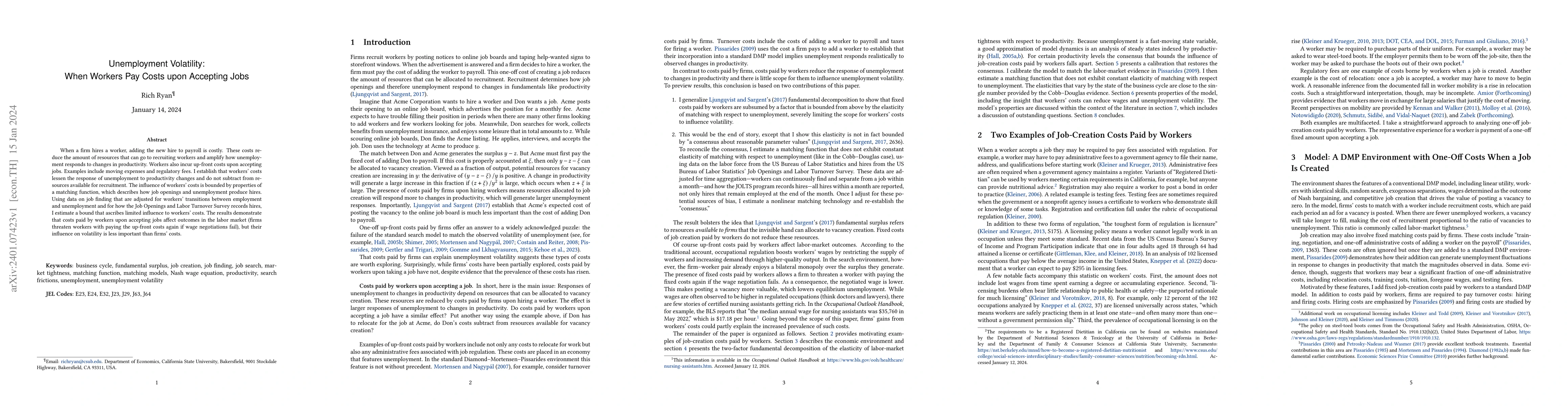 This paper investigates how workers' up-front costs, such as moving expenses and regulatory fees, influence unemployment volatility and firm hiring costs. It finds that while these costs affect labor market outcomes, they have a limited impact on unemployment's response to productivity changes compared to firms' hiring costs.