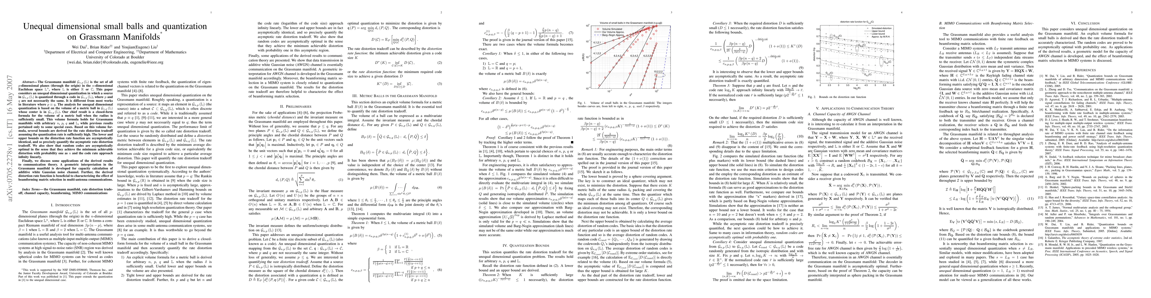 The Grassmann manifold G_{n,p}(L) is the set of all p-dimensional planes (through the origin) in the n-dimensional Euclidean space L^{n}, where L is either R or C. This paper considers an unequal dimensional quantization in which a source in G_{n,p}(L) is quantized through a code in G_{n,q}(L), where p and q are not necessarily the same. It is different from most works in literature where p\equiv q. The analysis for unequal dimensional quantization is based on the volume of a metric ball in G_{n,p}(L) whose center is in G_{n,q}(L). Our chief result is a closed-form formula for the volume of a metric ball when the radius is sufficiently small. This volume formula holds for Grassmann manifolds with arbitrary n, p, q and L, while previous results pertained only to some special cases. Based on this volume formula, several bounds are derived for the rate distortion tradeoff assuming the quantization rate is sufficiently high. The lower and upper bounds on the distortion rate function are asymptotically identical, and so precisely quantify the asymptotic rate distortion tradeoff. We also show that random codes are asymptotically optimal in the sense that they achieve the minimum achievable distortion with probability one as n and the code rate approach infinity linearly. Finally, we discuss some applications of the derived results to communication theory. A geometric interpretation in the Grassmann manifold is developed for capacity calculation of additive white Gaussian noise channel. Further, the derived distortion rate function is beneficial to characterizing the effect of beamforming matrix selection in multi-antenna communications.