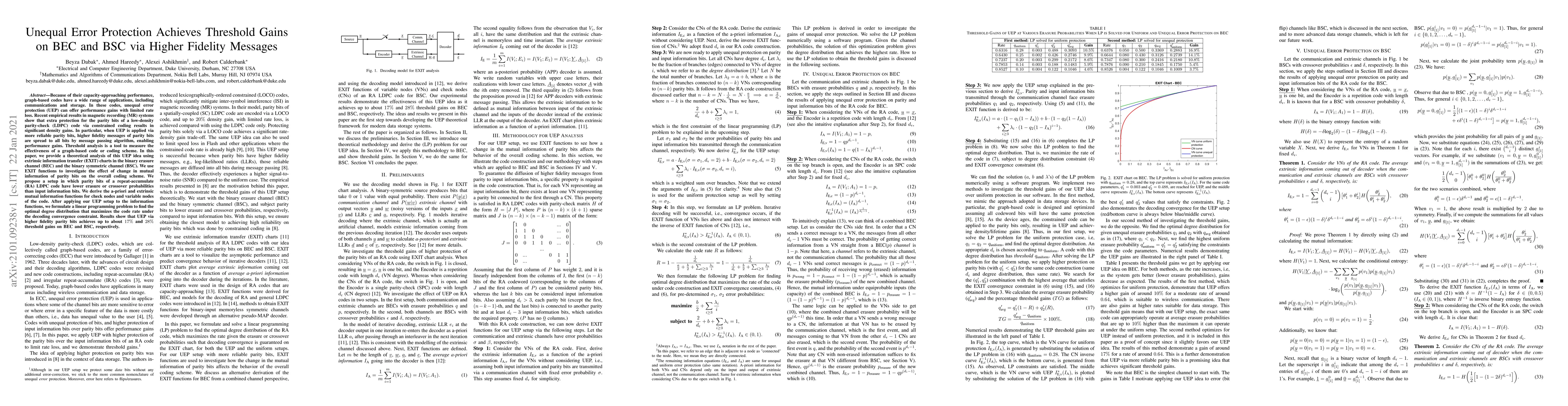 Because of their capacity-approaching performance, graph-based codes have a wide range of applications, including communications and storage. In these codes, unequal error protection (UEP) can offer performance gains with limited rate loss. Recent empirical results in magnetic recording (MR) systems show that extra protection for the parity bits of a low-density parity-check (LDPC) code via constrained coding results in significant density gains. In particular, when UEP is applied via more reliable parity bits, higher fidelity messages of parity bits are spread to all bits by message passing algorithm, enabling performance gains. Threshold analysis is a tool to measure the effectiveness of a graph-based code or coding scheme. In this paper, we provide a theoretical analysis of this UEP idea using extrinsic information transfer (EXIT) charts in the binary erasure channel (BEC) and the binary symmetric channel (BSC). We use EXIT functions to investigate the effect of change in mutual information of parity bits on the overall coding scheme. We propose a setup in which parity bits of a repeat-accumulate (RA) LDPC code have lower erasure or crossover probabilities than input information bits. We derive the a-priori and extrinsic mutual information functions for check nodes and variable nodes of the code. After applying our UEP setup to the information functions, we formulate a linear programming problem to find the optimal degree distribution that maximizes the code rate under the decoding convergence constraint. Results show that UEP via higher fidelity parity bits achieves up to about $17\%$ and $28\%$ threshold gains on BEC and BSC, respectively.