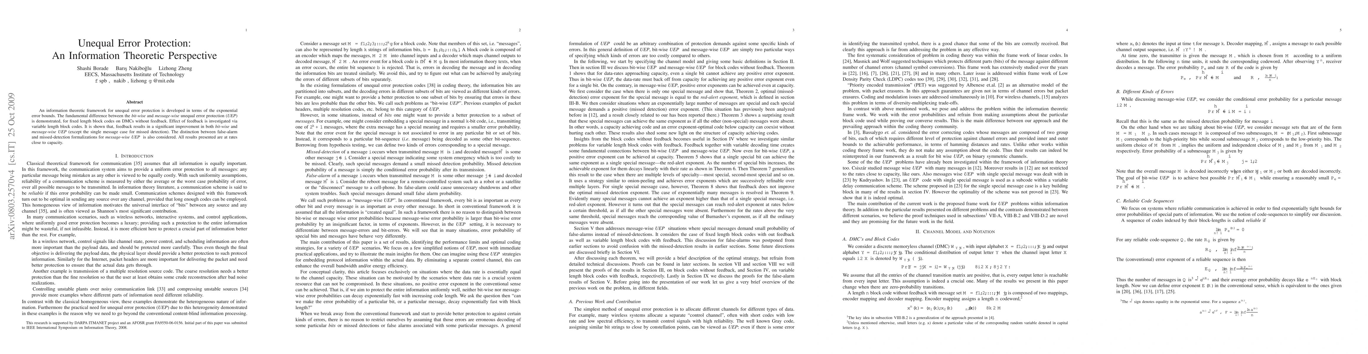 This paper develops an information theoretic framework for unequal error protection using exponential error bounds, comparing bit-wise and message-wise UEP for fixed and variable length block codes on DMCs. Feedback is shown to significantly improve both error protection types, except for missed detection in single message cases.