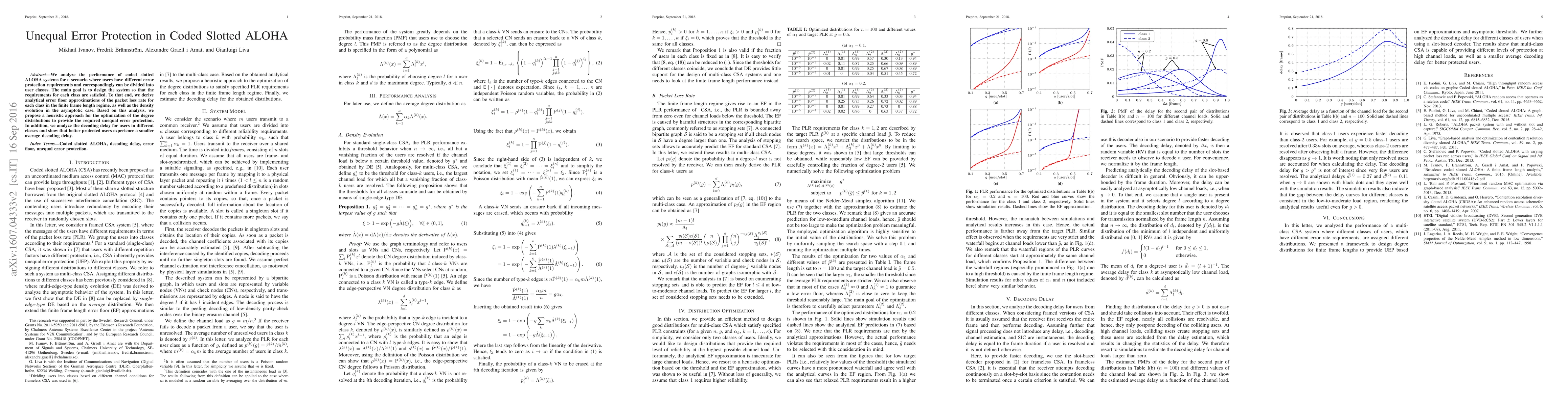 This paper analyzes the performance of coded slotted ALOHA systems with unequal error protection for different user classes, deriving analytical approximations for packet loss rates and proposing a heuristic approach to optimize degree distributions. It also examines decoding delays, finding that better-protected users experience shorter delays.