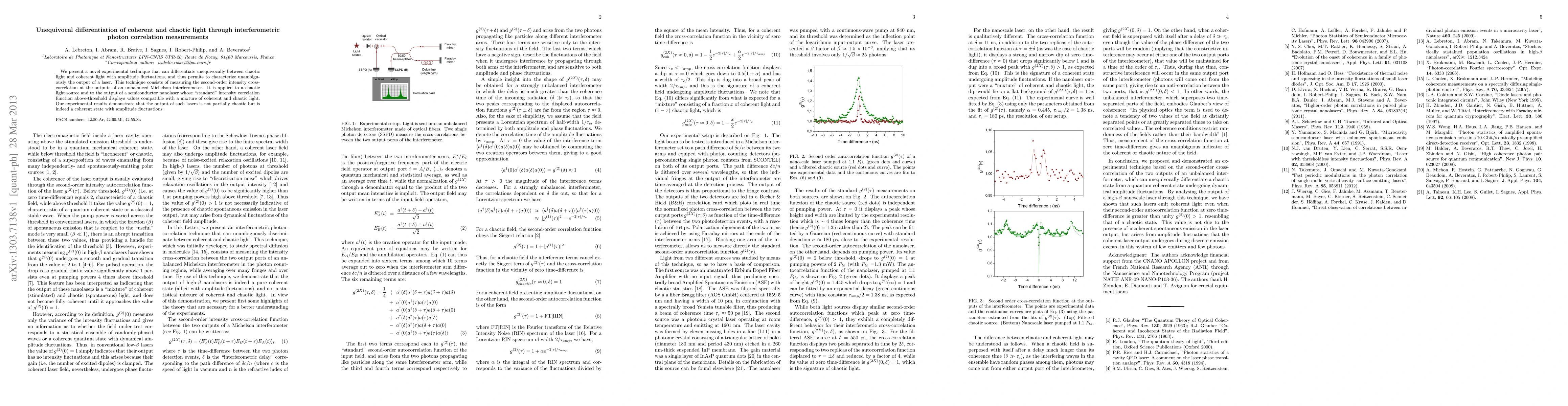 This paper introduces a new method to distinguish between coherent and chaotic light using interferometric photon correlation measurements, showing that the output of semiconductor nanolasers is coherent despite amplitude fluctuations. The technique measures second-order intensity cross-correlation in an unbalanced Michelson interferometer.