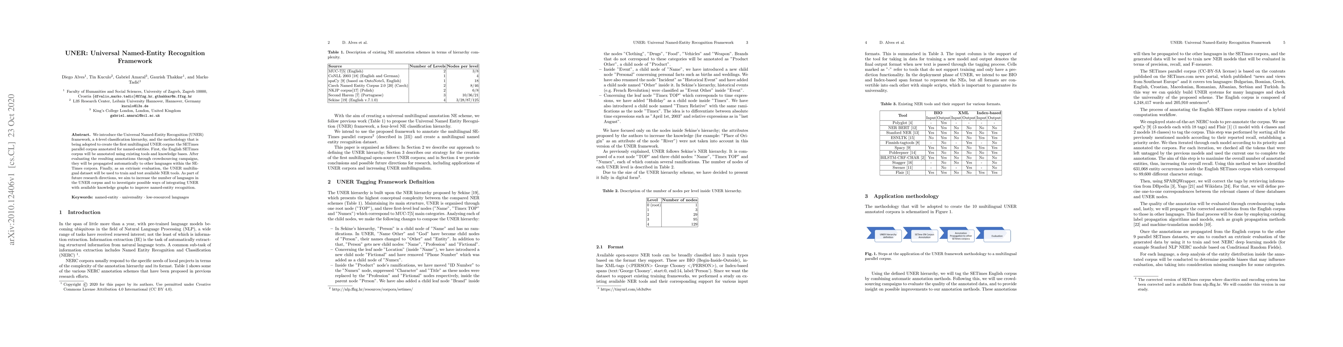 The UNER framework introduces a 4-level classification hierarchy for universal named-entity recognition, creating a multilingual UNER corpus through the SETimes parallel corpus. The framework will be evaluated and expanded to include more languages and integrate with knowledge graphs for enhanced performance.