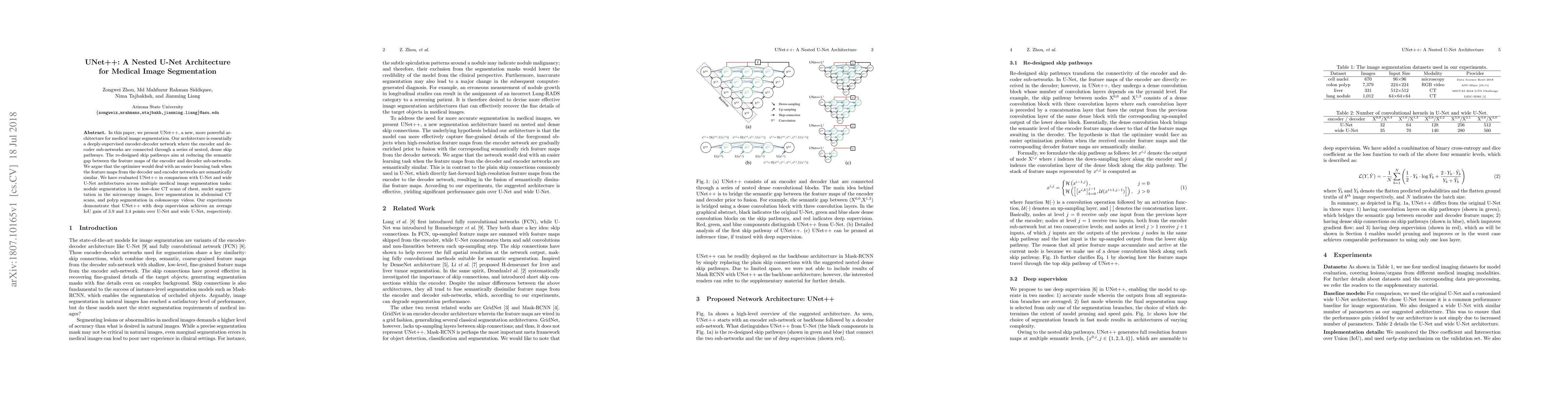 In this paper, we present UNet++, a new, more powerful architecture for medical image segmentation. Our architecture is essentially a deeply-supervised encoder-decoder network where the encoder and decoder sub-networks are connected through a series of nested, dense skip pathways. The re-designed skip pathways aim at reducing the semantic gap between the feature maps of the encoder and decoder sub-networks. We argue that the optimizer would deal with an easier learning task when the feature maps from the decoder and encoder networks are semantically similar. We have evaluated UNet++ in comparison with U-Net and wide U-Net architectures across multiple medical image segmentation tasks: nodule segmentation in the low-dose CT scans of chest, nuclei segmentation in the microscopy images, liver segmentation in abdominal CT scans, and polyp segmentation in colonoscopy videos. Our experiments demonstrate that UNet++ with deep supervision achieves an average IoU gain of 3.9 and 3.4 points over U-Net and wide U-Net, respectively.