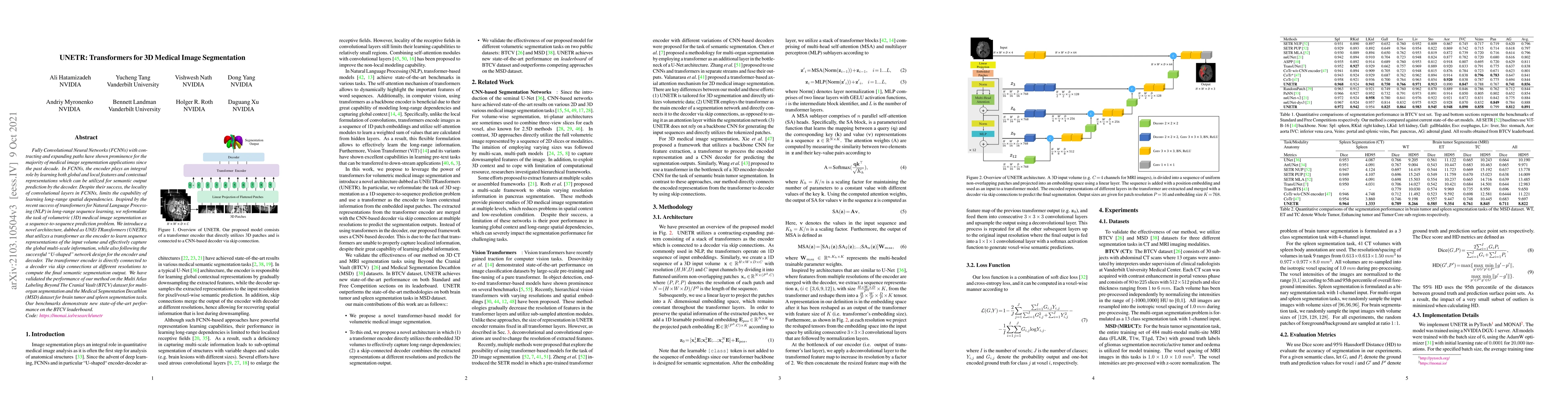 The paper introduces UNETR, a novel architecture combining transformers and U-Net for 3D medical image segmentation, leveraging transformers to capture global multi-scale information and achieving state-of-the-art results on the BTCV and MSD datasets. The method reformulates segmentation as a sequence-to-sequence prediction, showing improved performance over traditional convolutional networks.